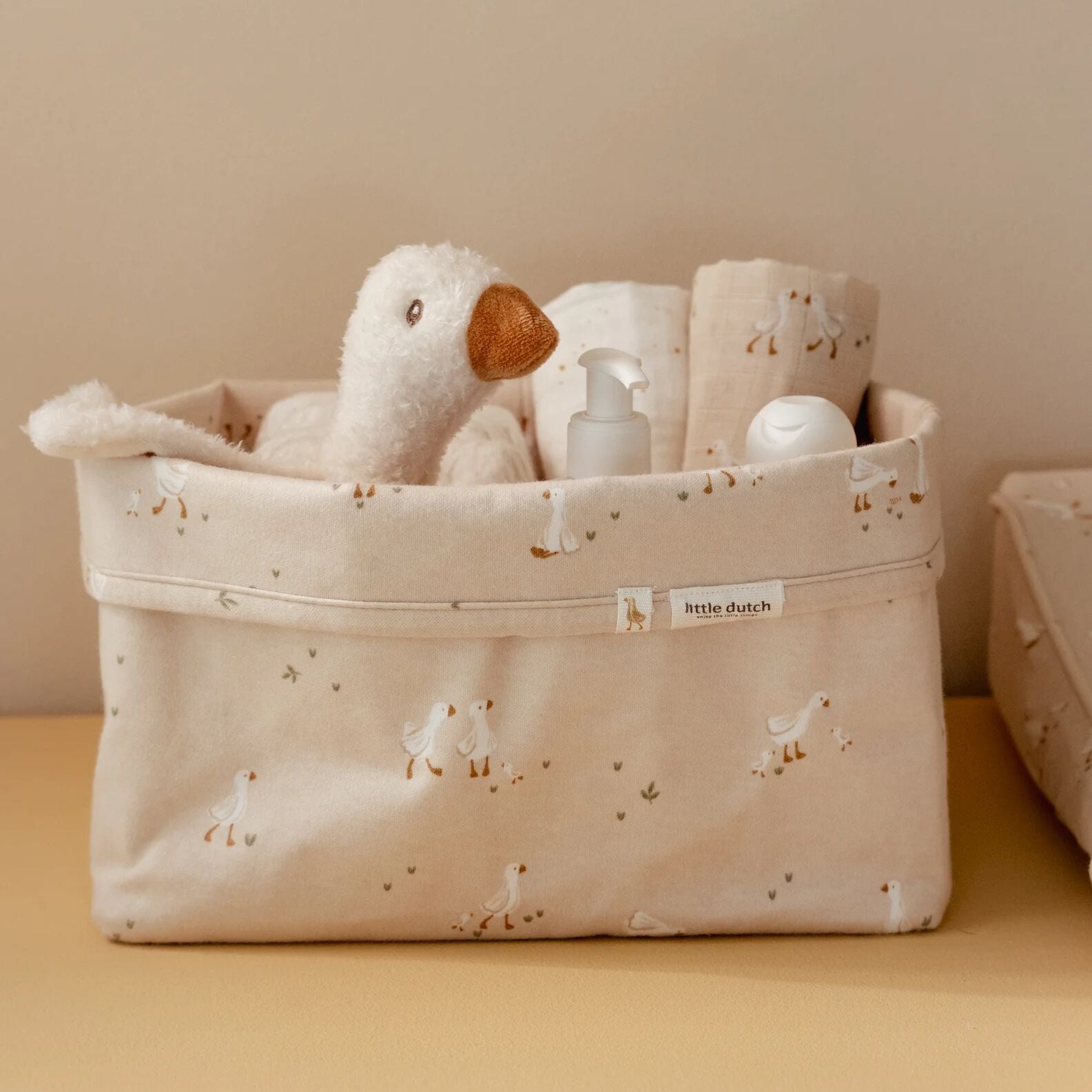 The Little Dutch commodity basket is beautifully finished and offers a storage place for all the products you need to care for your baby every day. A lovely accessory for the nursery. This one from the Little Goose collection in lovely quiet colour is enriched with sweet goose print. Also available in other sizes and shapes.