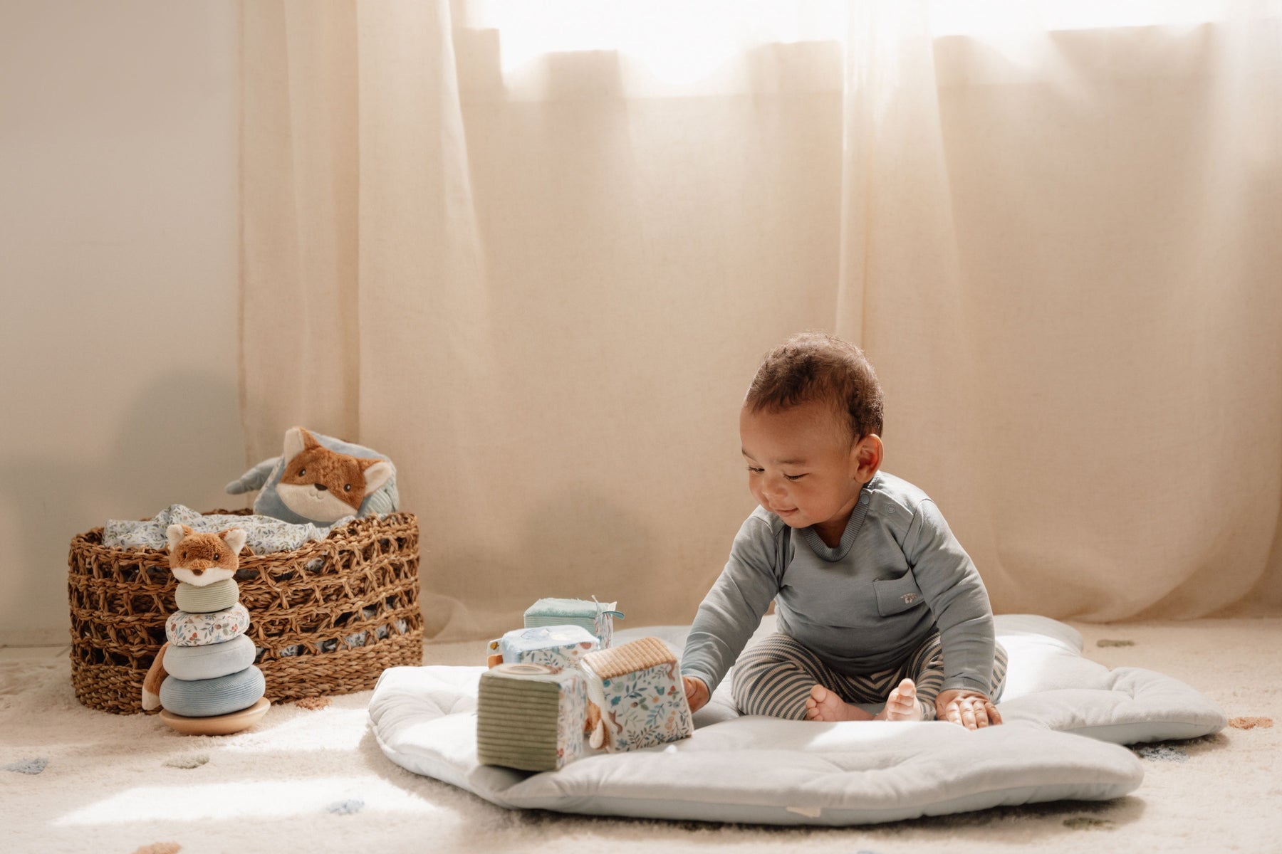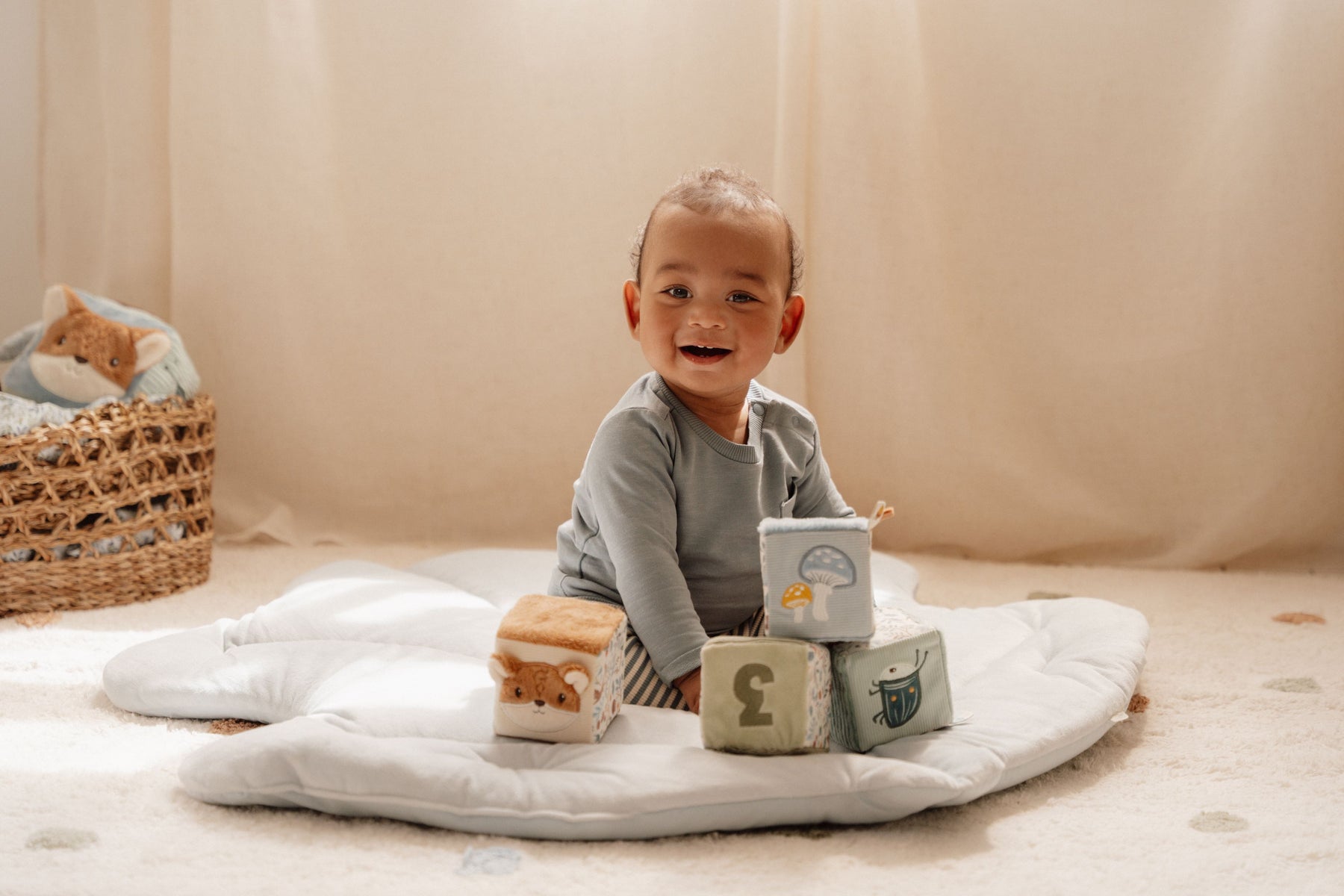 Ring, rattle, and roll! With varied sounds, textures, and features to explore, this fun set of Little Dutch soft activity blocks from the Forest Friends collection will keep your little one entertained. Plus, it stimulates hand-eye coordination. The cheery set consists of four multi-sensory blocks, each one defined by soft colours and decorated with a unique number. Baby hands will also discover our captivating labels, plush panels, and the nutty mirror.