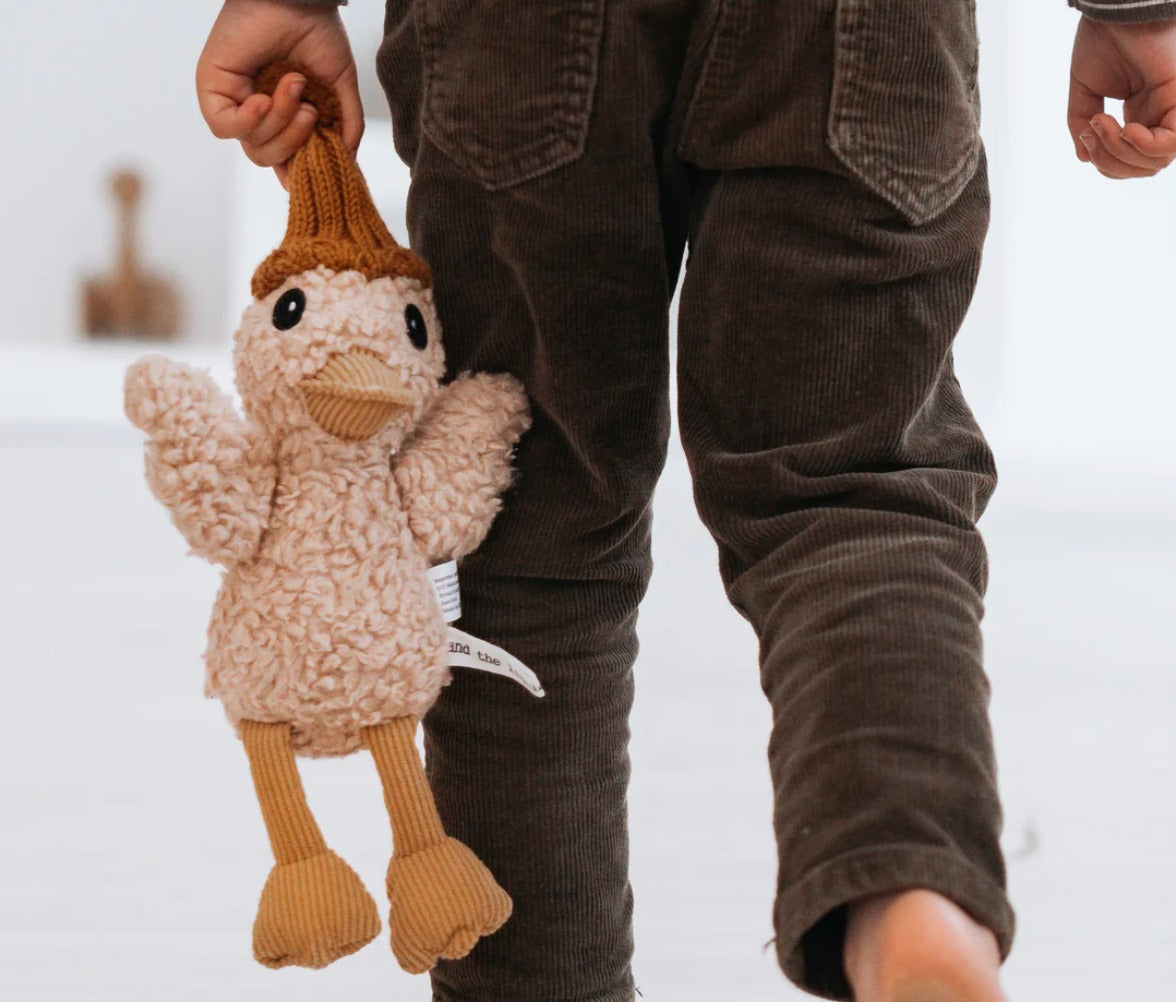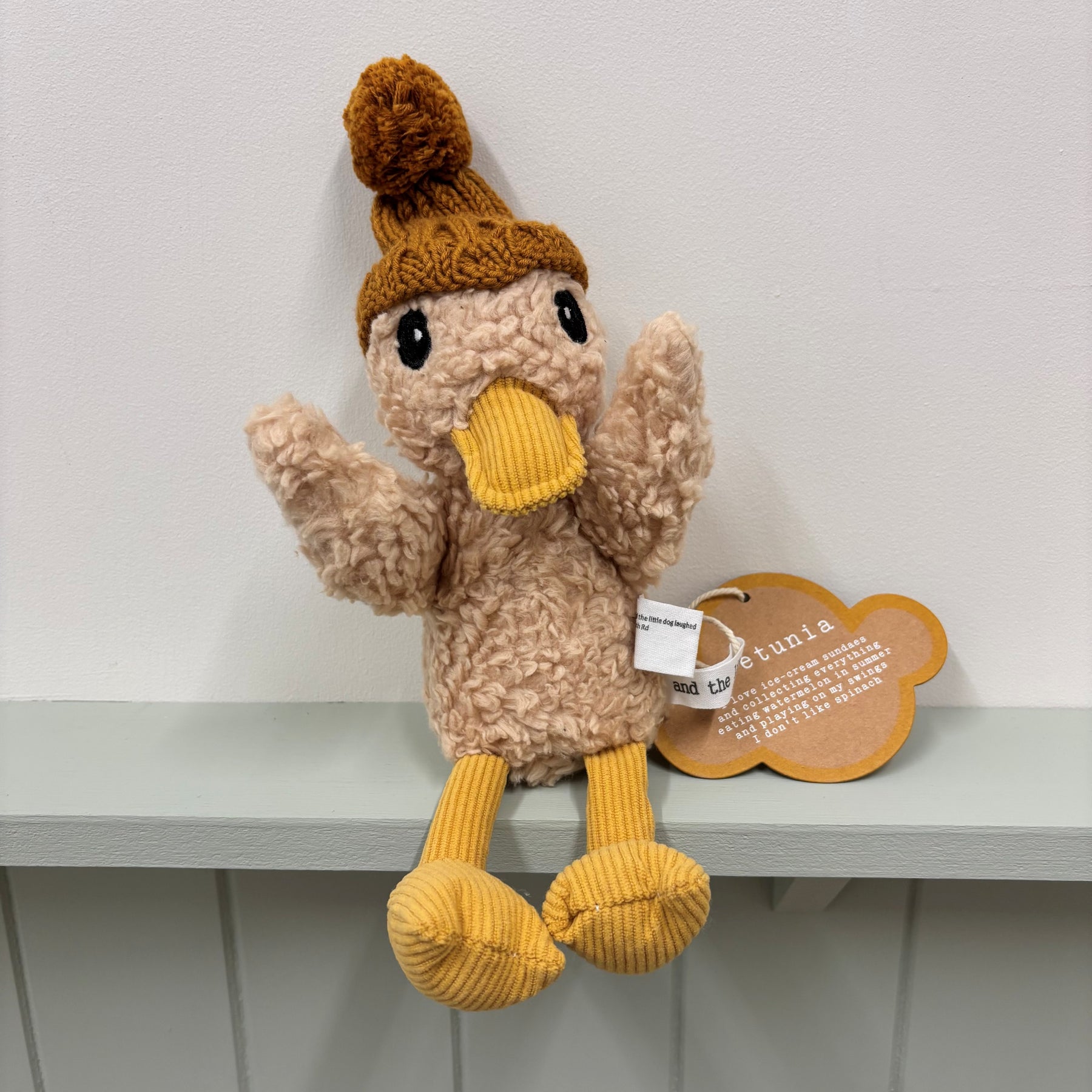 Introducing Peunia Duck, our unique and quirky plush forever friend. Made with super soft cotton fabric, and accented with soft yellow corduroy, Petunia loves icecream sundaes and collecting everything, eating watermelon in the summmer and playing on her swings. I don't like spinach.