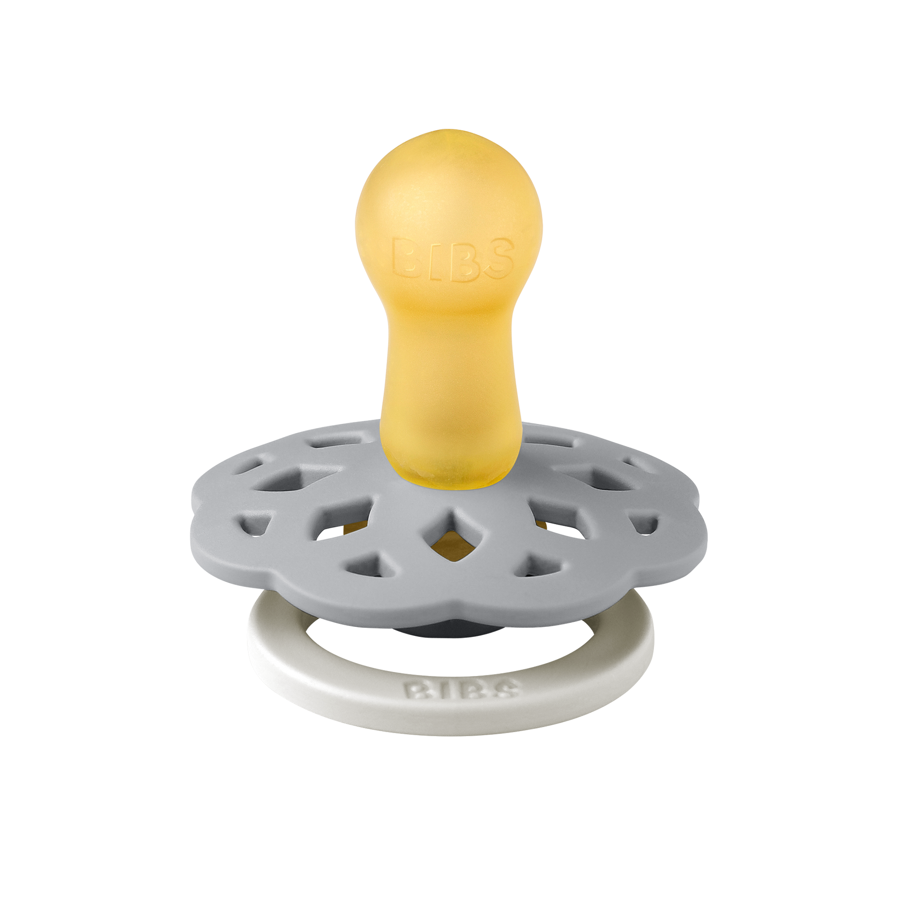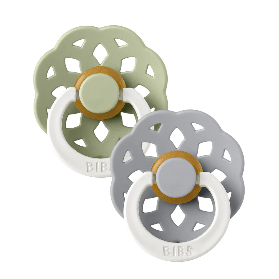 Bibs boheme pacifier is inspired by the modern bohemian style with its natural elements and organic silhouette. Bibs pacifiers are designed to help calm and soothe your baby, lower stress levels and provide a sense of security when they're upset. The round lightweight shield faces away from the sensitive and delicate skin around the baby's mouth to ensure minimum contact with the baby's nose and mouth, which means less chance of moisture build-up from saliva that can cause rashes and sore spots. Bibs glow pacifiers make it easy for both parents and little ones to find the pacifiers in the dark due to their glow in the dark components. Simply hold the pacifier up to a light source for 5 to 10 sec. to activate the effect which lasts for 8+ hours. The round nipple shape is designed to help soothe your baby, while promoting a similar sucking technique as when breastfeeding. The nipple is equipped with a valve that lets out air when the baby closes down on the nipple thereby flattening the nipple to shape naturally after the baby's oral cavity. Explore the full Bibs range or shop our baby and toddler care collection. Features of the Bibs Boheme Pacifier:
