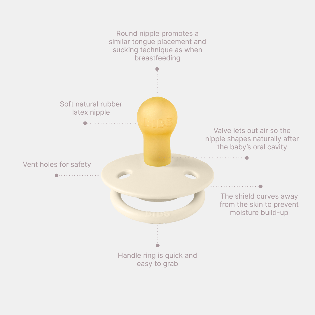 Bibs glow colour pacifier is their original pacifier design, featuring the classic shield and round nipple design. Bibs pacifiers are designed to help calm and soothe your baby, lower stress levels and provide a sense of security when they're upset. The colour pacifier features three vent holes, a round engraved handle ring and made from lightweight 100% safe and food-grade material. Bibs glow pacifiers make it easy for both parents and little ones to find the pacifiers in the dark due to their glow in the dark components. Simply hold the pacifier up to a light source for 5 to 10 sec. to activate the effect which lasts for 8+ hours. The round nipple shape is designed to help soothe your baby, while promoting a similar sucking technique as when breastfeeding. The nipple is equipped with a valve that lets out air when the baby closes down on the nipple thereby flattening the nipple to shape naturally after the baby's oral cavity. Explore the full Bibs range or shop our baby and toddler care collection. Features of the Bibs Colour Pacifier: