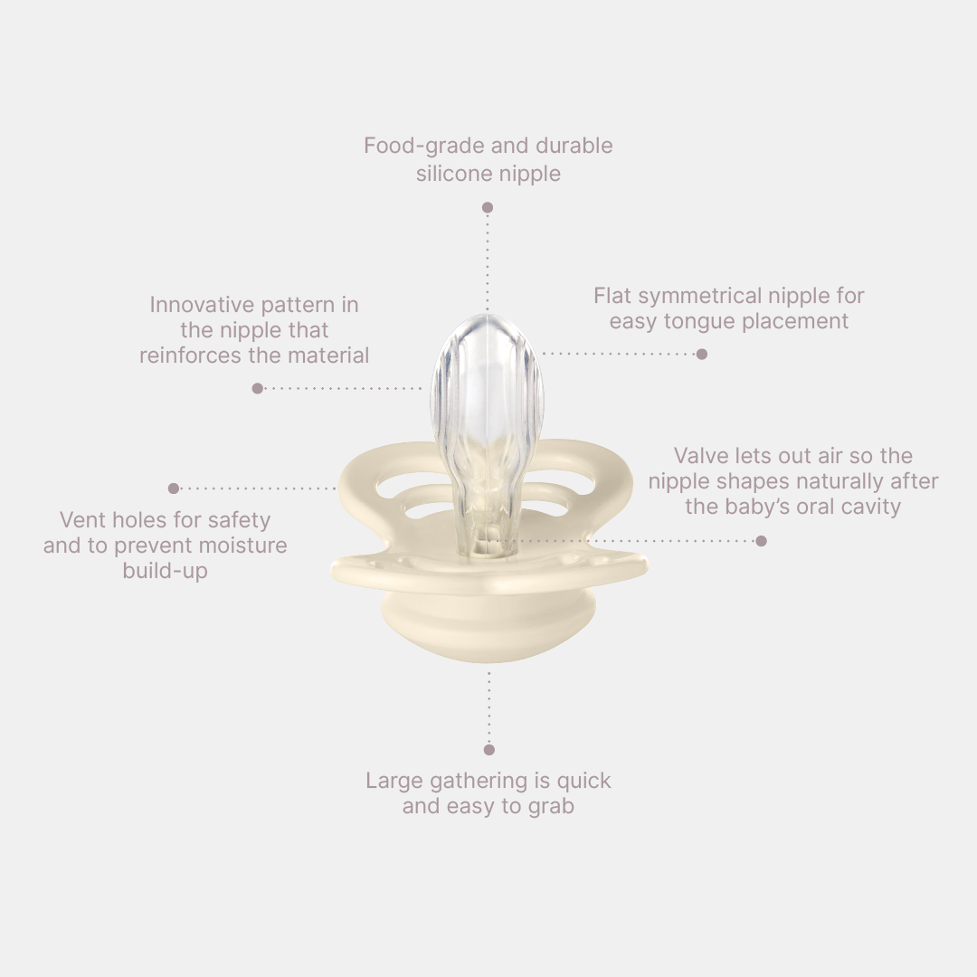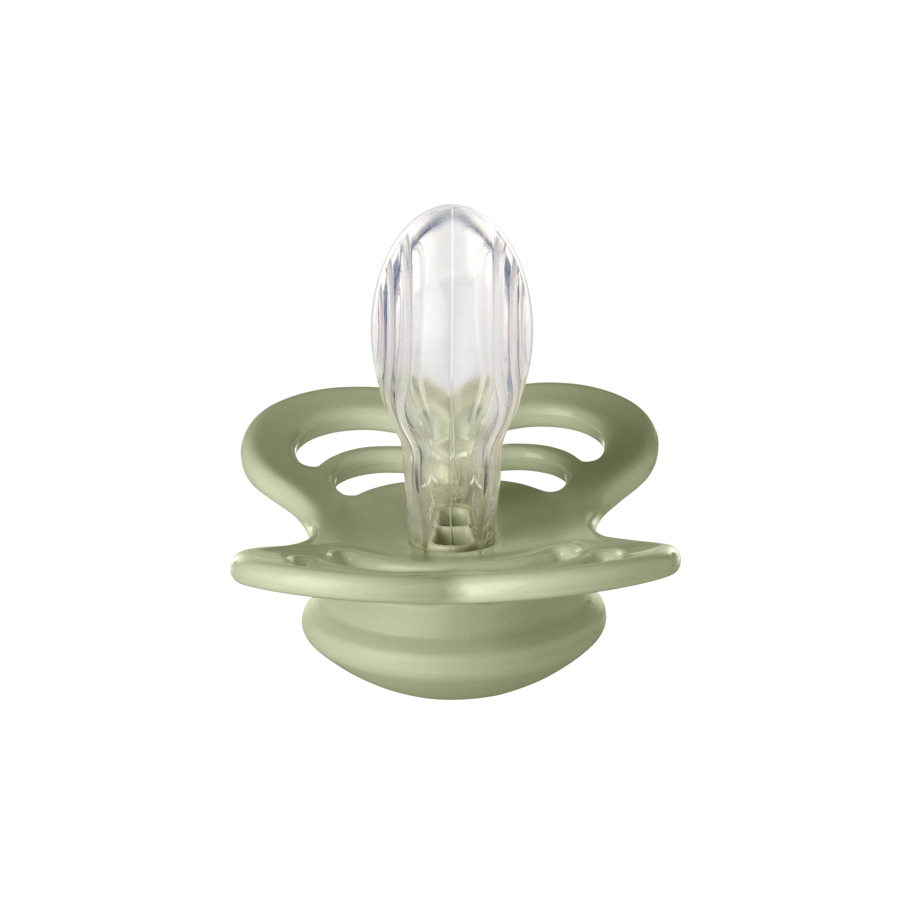 Included: Two supreme pacifiers with a symmetrical nipple, one in ivory and the other in sage.