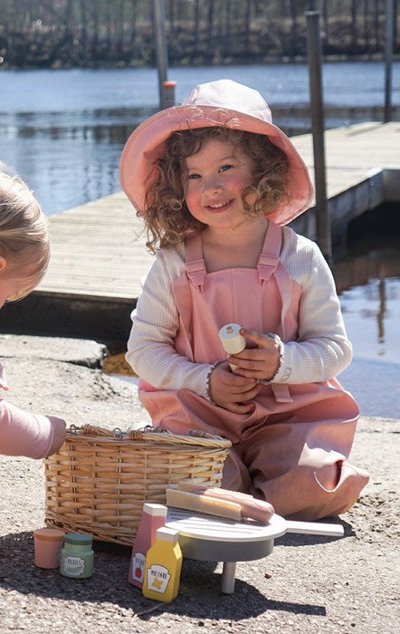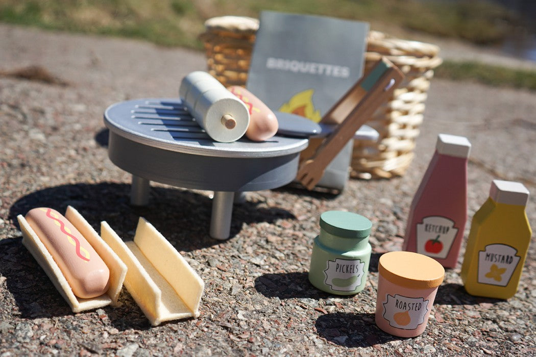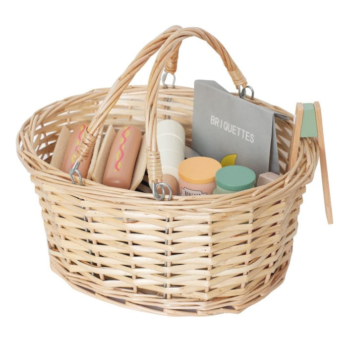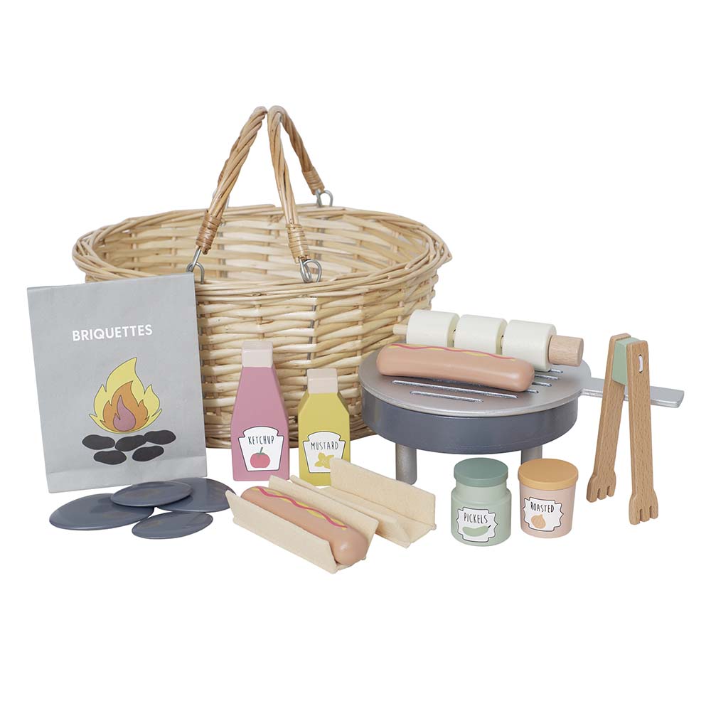 Now you can go out into the forest this summer and have a pretend wooden BBQ with your friends. All items fit into a real wicker basket, making it easy to carry and mess free when storing! Jabadabado's BBQ basket includes everything for a successful barbecue while enhancing roleplay.