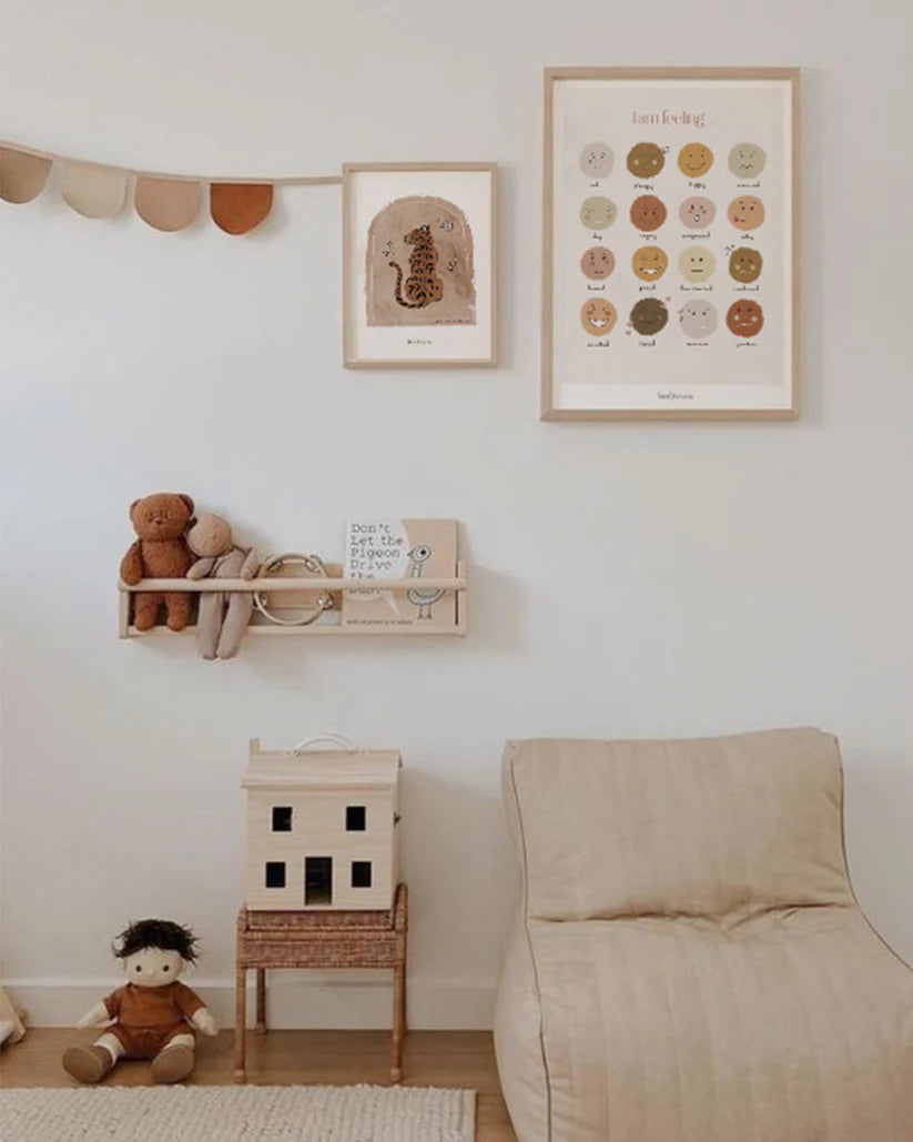 Ignite your child's creativity and learning with Lion & The Pear highly detailed hand-drawn big little feelings poster created in beautiful natural tonal hues and delightful characters, each face displaying a different emotion. A great piece to help toddlers to tweens understand the full range of human emotions