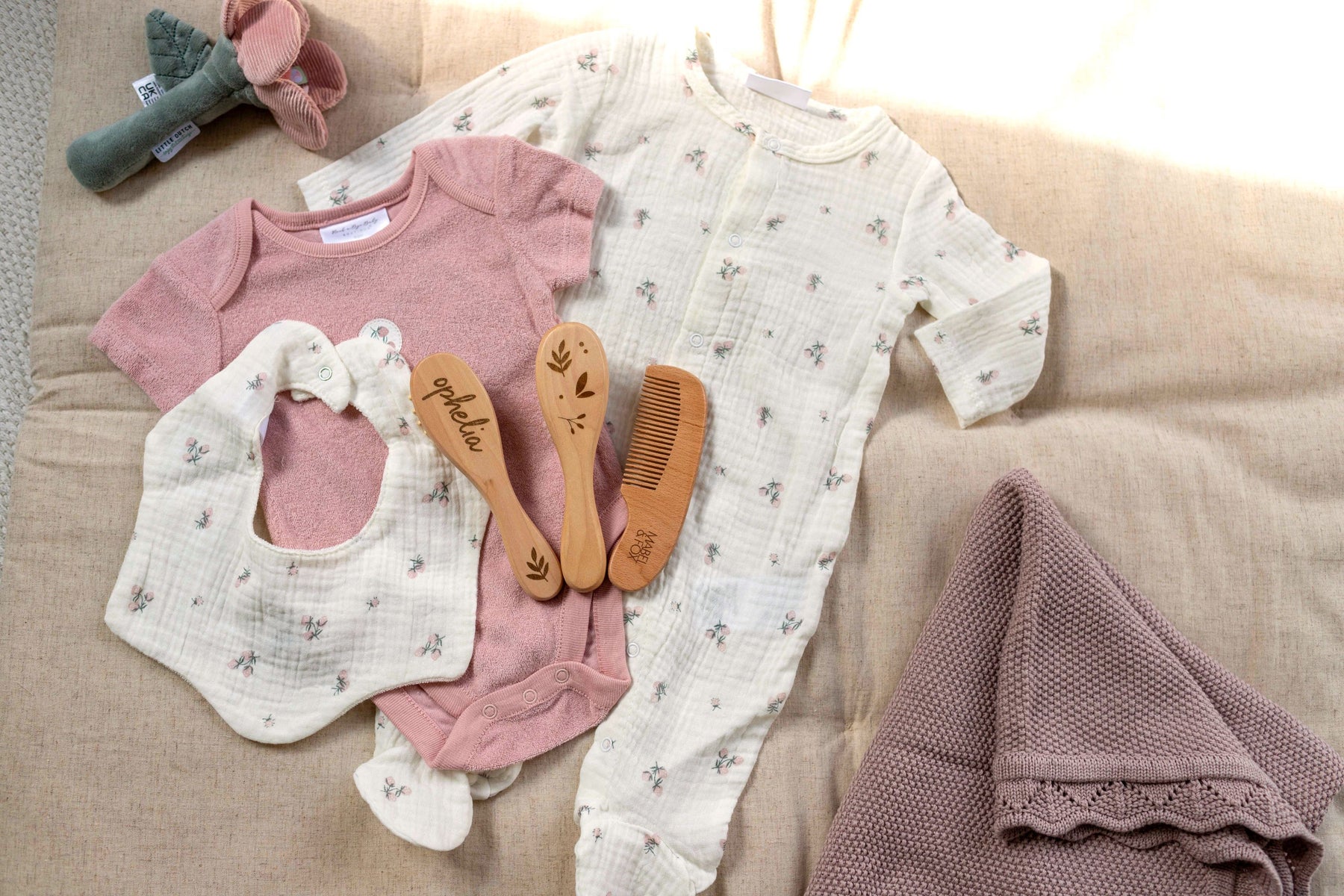 Introducing Mabel & Fox's Personalised Wooden Brush Set, a must-have for babies. Featuring three high quality wooden brushes, paired with a beautiful reusable brown striped bag for added convenience. The wooden bristle brush is engraved with your choice of any name, while the matching goat hair brush has a complimentary botanical pattern engraved.