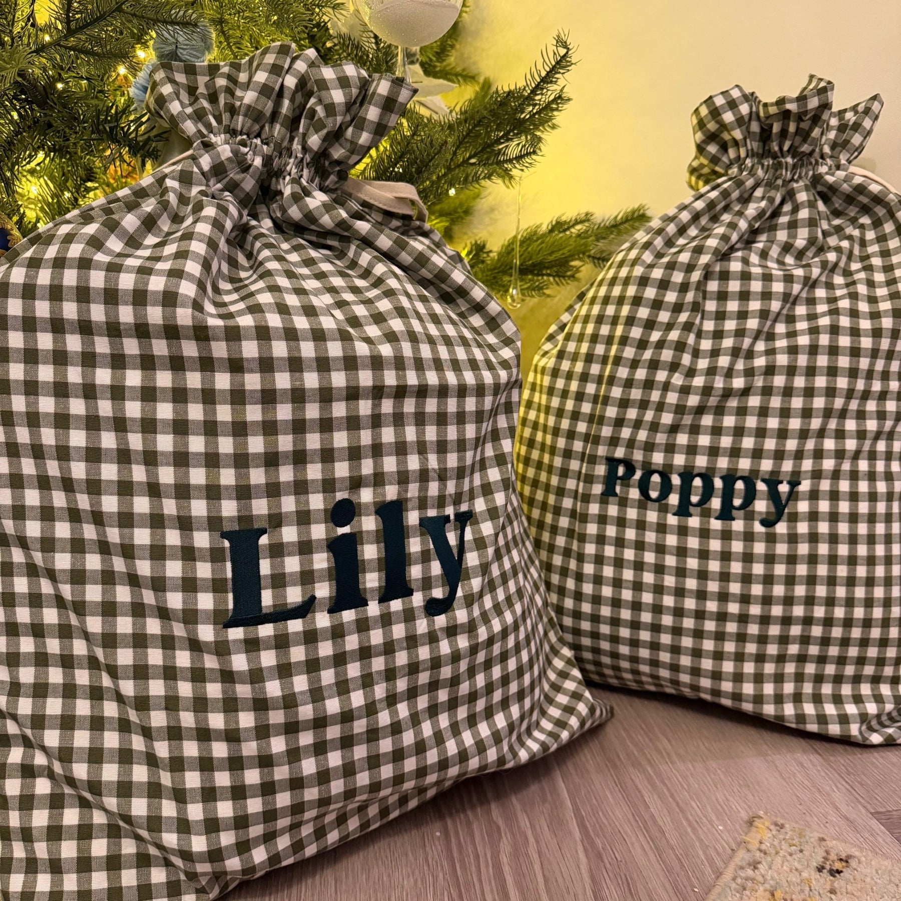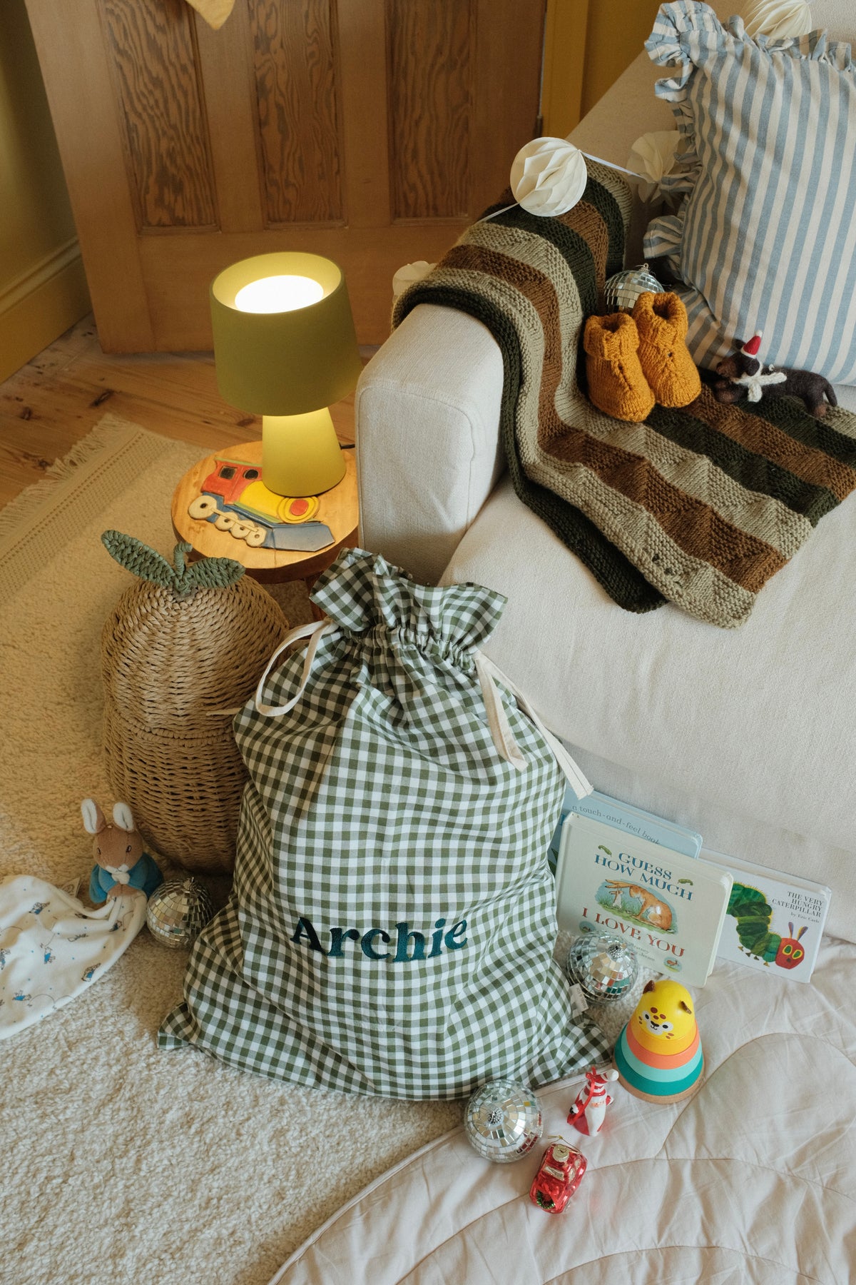Elevate your gifting with our large Mabel & Fox Personalised Gift Sack in beautiful gingham fabric. This beautiful gift sack features an embroidered name, making it the perfect bespoke addition to your festive decor. It's perfect for birthdays, baby showers, and Christmas, and designed to be reused year after year!