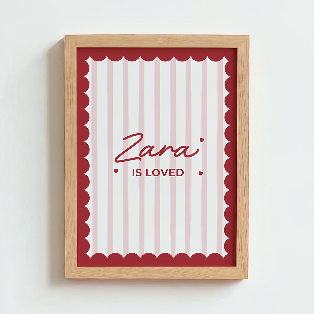 Add a touch of love to a little one’s space with this personalised Mabel & Fox art print. Designed in soft pinks and vibrant reds, this charming print is filled with heart details and can be personalised with any name, making it irresistibly cute.