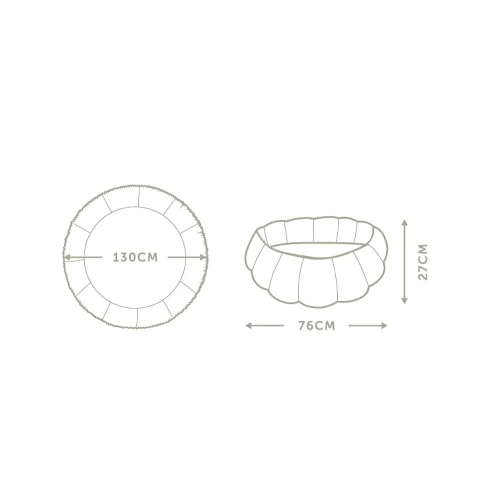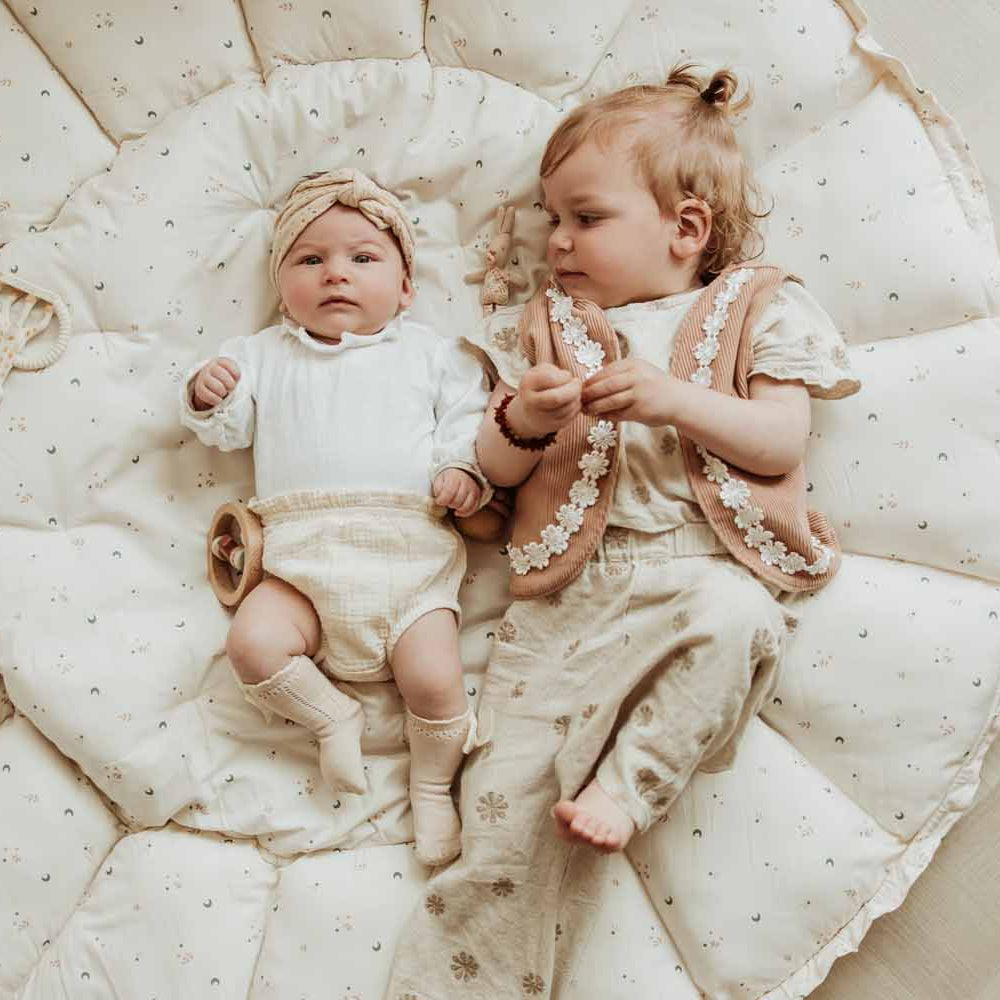Made with GOTS-certified organic cotton and padded with GRS-certified recycled PET, coco offers a safe and snug space for tummy time, bonding, and quiet observation. When drawn into its nest shape, it forms a secure cocoon where favorite toys can be stored and moments of calm begin.