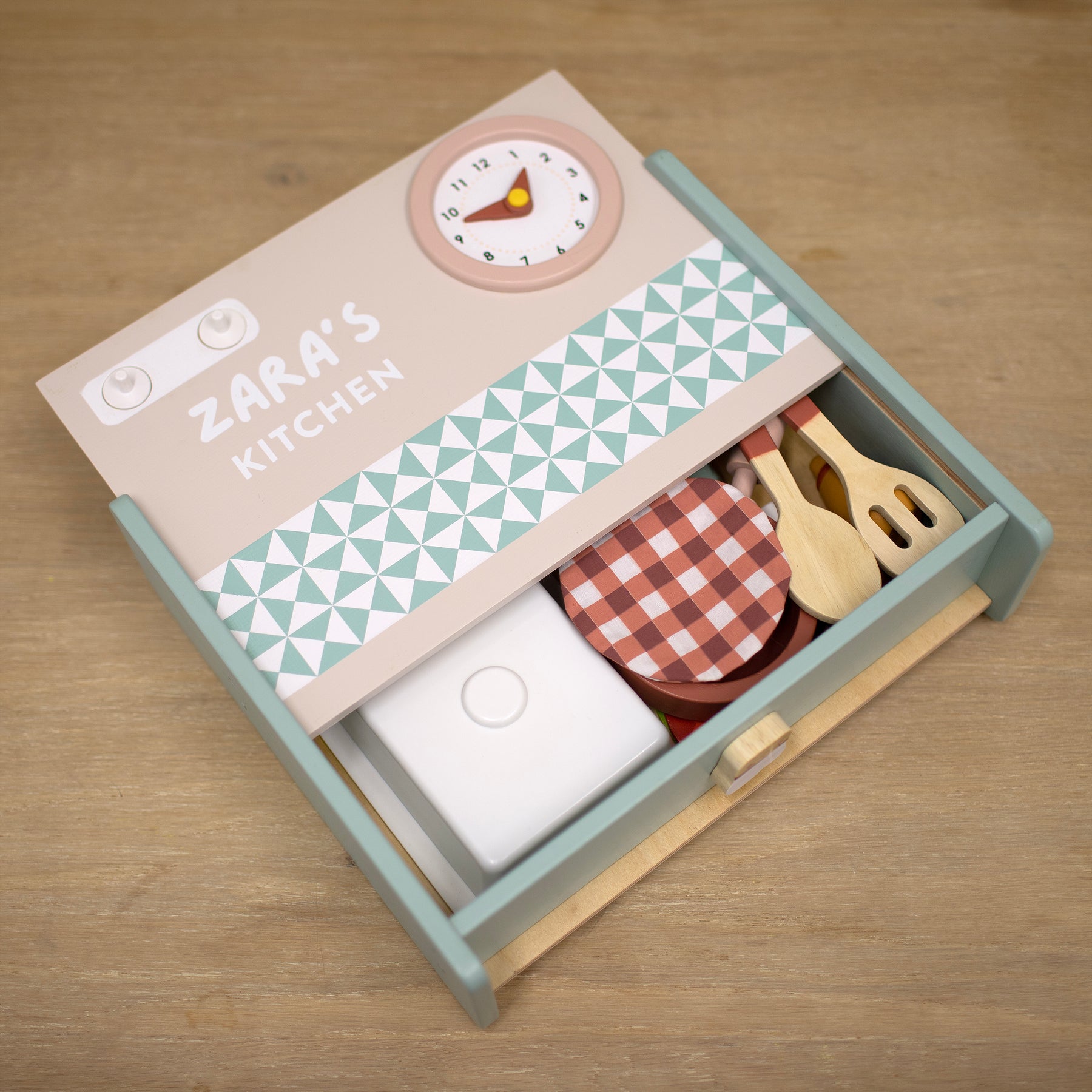 Take your cooking on the go with Tender Leaf Toys' - Personalised Kitchenette! This portable fold away kitchenette features a hob and clacking dial, as well as a waterproof sink and a pretty clock to practice telling time. Watch your child develop fine motor and language skills while having fun with this bespoke toy personalised with their name.