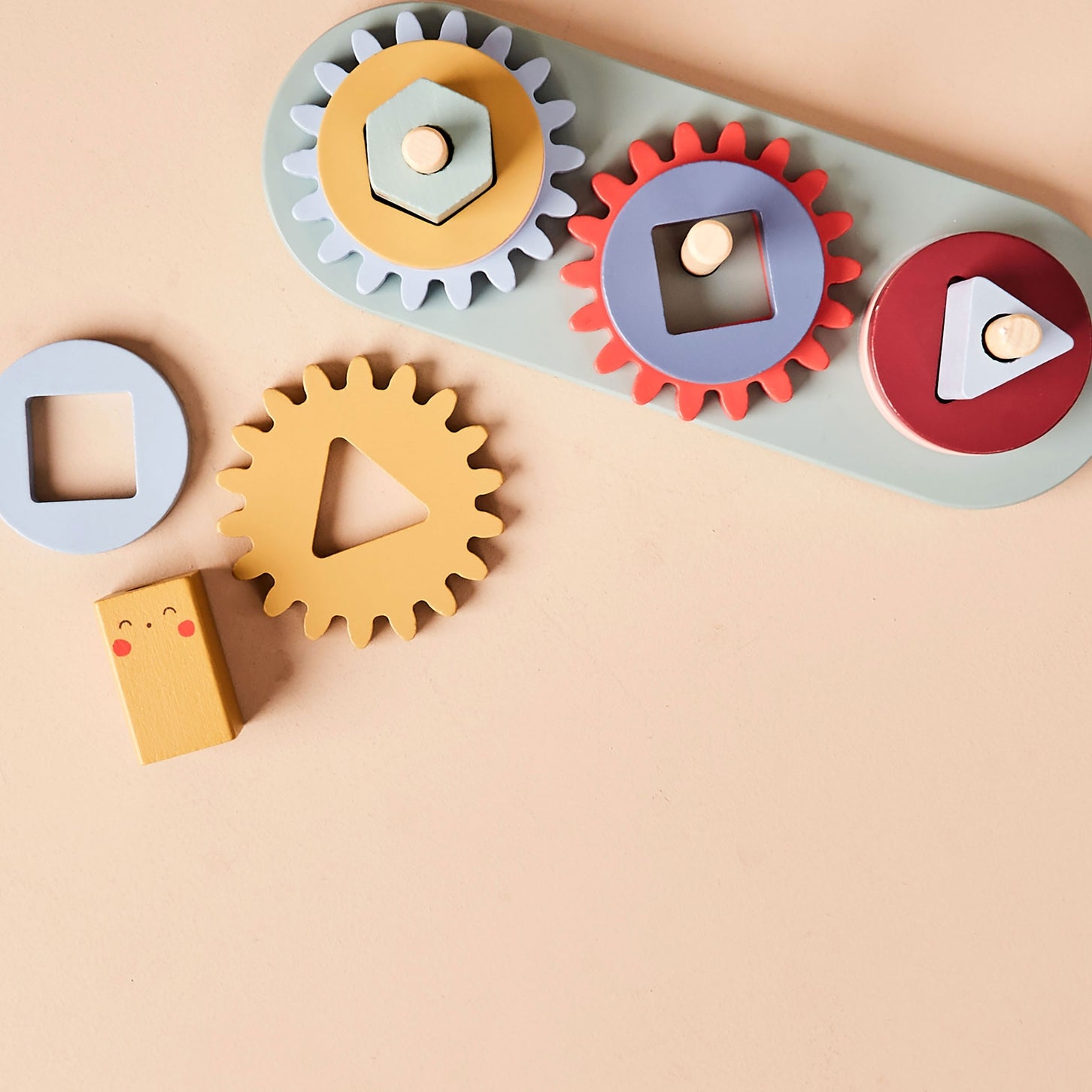 • Brightly painted wooden cog toy with chunky pieces and slot blocks