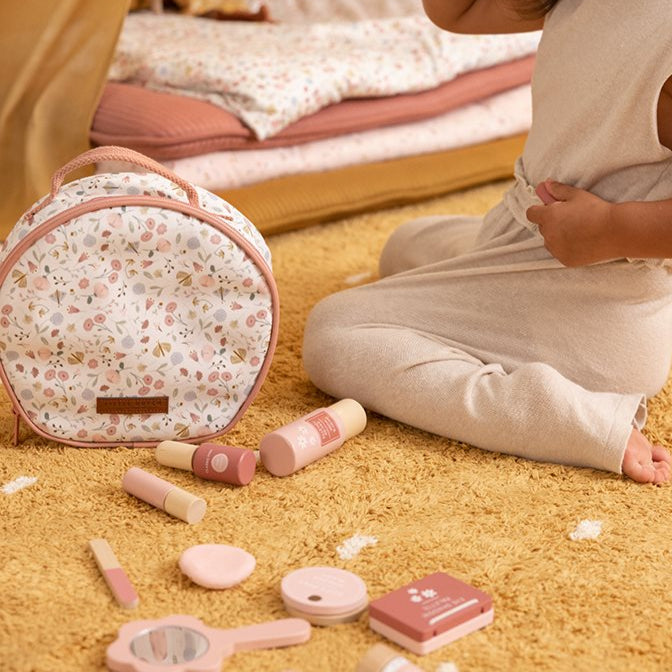 Inspire imaginative play with this Little Dutch beauty case. Enhanced with a vivid floral pattern, it comes with ten different pretend play wooden beauty products. Kids love to mimic their parents routines, and this kit promotes social skills, coordination role play and vocabulary building.