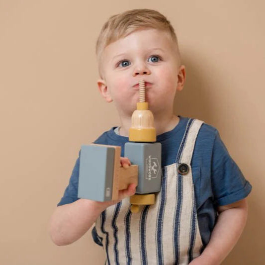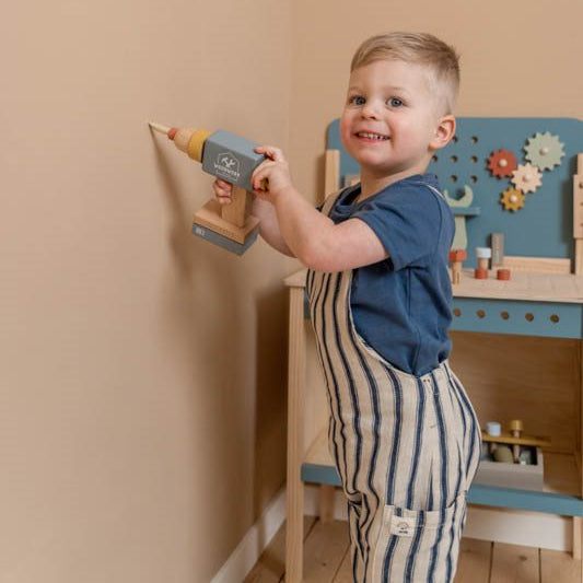 This pretend wooden drill by Little Dutch inspires imagination and creativity, through roleplay. It also helps to develop motor skills when they exchange the tips, turn the wheel and change the battery that’s attached to the bottom (velcro).