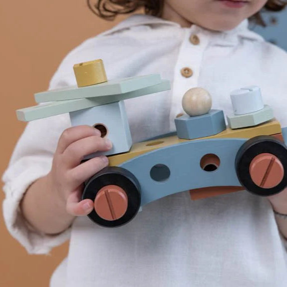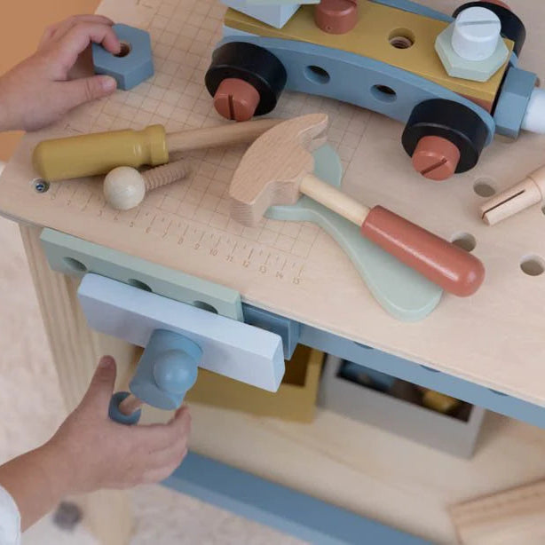 With this workbench by Little Dutch you can fix and repair just about anything you can imagine. Grab your tools and start constructing. Build a car, a motorcycle or your own creation by simply connecting parts together.