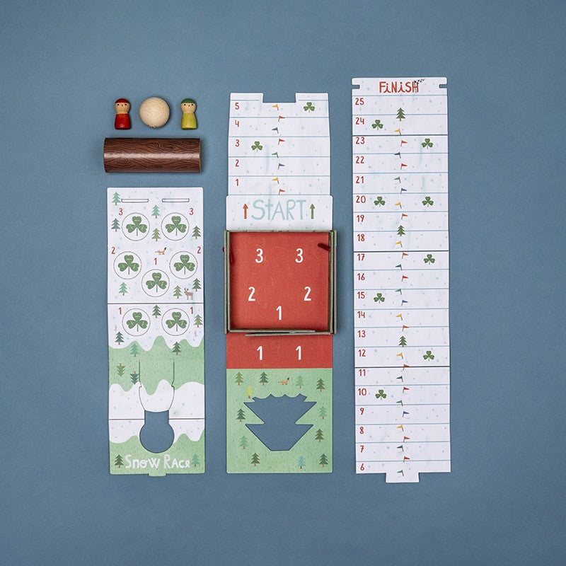 In Snow Race, players roll the ball-shaped die, move their pieces and complete clover actions as they compete to be the first across the line. Designed for two players aged four and up, this engaging racing game encourages turn-taking, focus and simple strategic thinking. Made from FSC paper, recycled cardboard and solid beech wood, it’s a more sustainable choice for families looking for thoughtful, long-lasting play. Its compact format makes it perfect for holidays, outings or cosy afternoons at home.