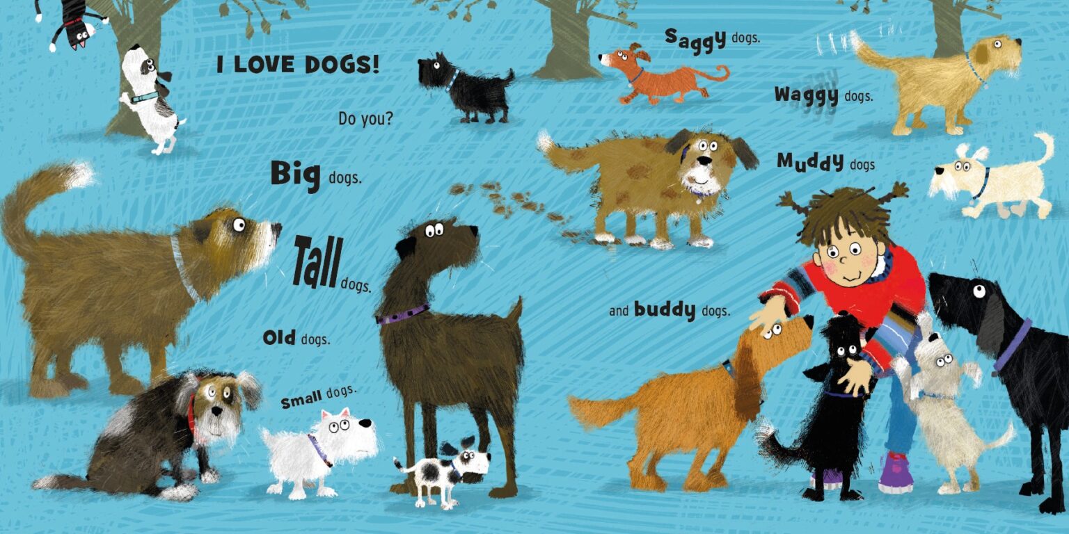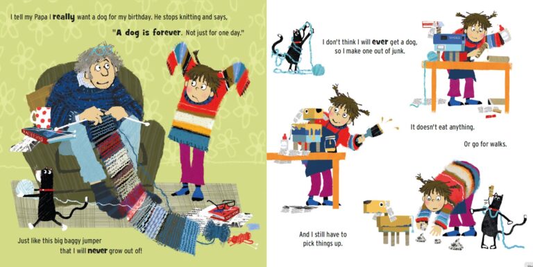 I LOVE DOGS! says Ava, who desperately wants a dog. Any dog. Tall, small, saggy or waggy. Every day, she asks her parents for a dog and is told they need a lot of looking after. Dogs are forever, not just for Christmas. Just like her Papas big baggy knitted jumpers.