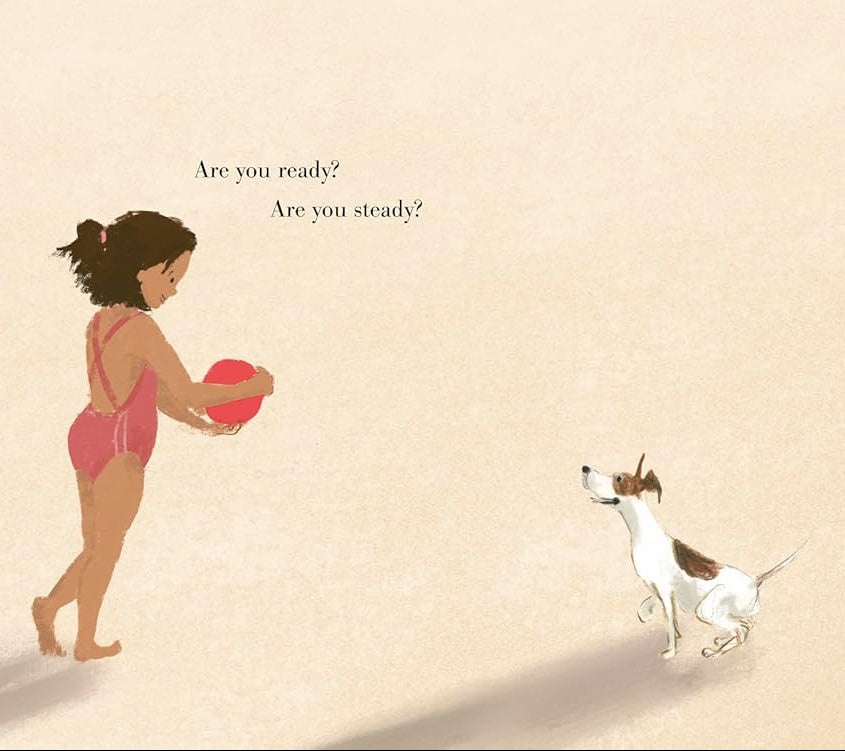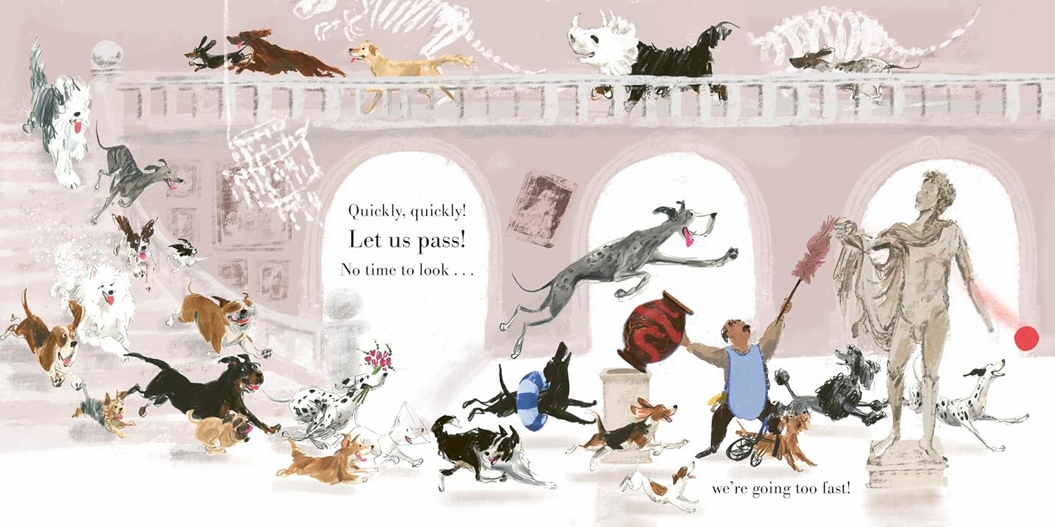 The race leads them down the beach, through the city, into the museum; high up over the city balanced on an iron girder; through the park down the river, until: what’s that rumbling sound? Oh dear! But not even a thundering waterfall will stop these determined dogs from chasing down that ball…
