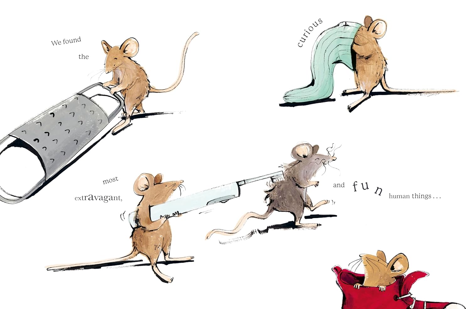At first, the mice are wary, but curiosity soon takes over. They investigate the strange objects and delicious food their guests have brought with them and decide maybe humans aren’t so bad after all . . . until one mouse gets trapped in a jar.