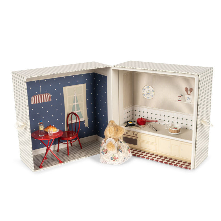 This miniature marvel is packed with charm, from its polka-dot dining nook to its perfectly pint-sized oven. There’s even a teddy bear waiting patiently at the table, just in case you fancy a snack.
