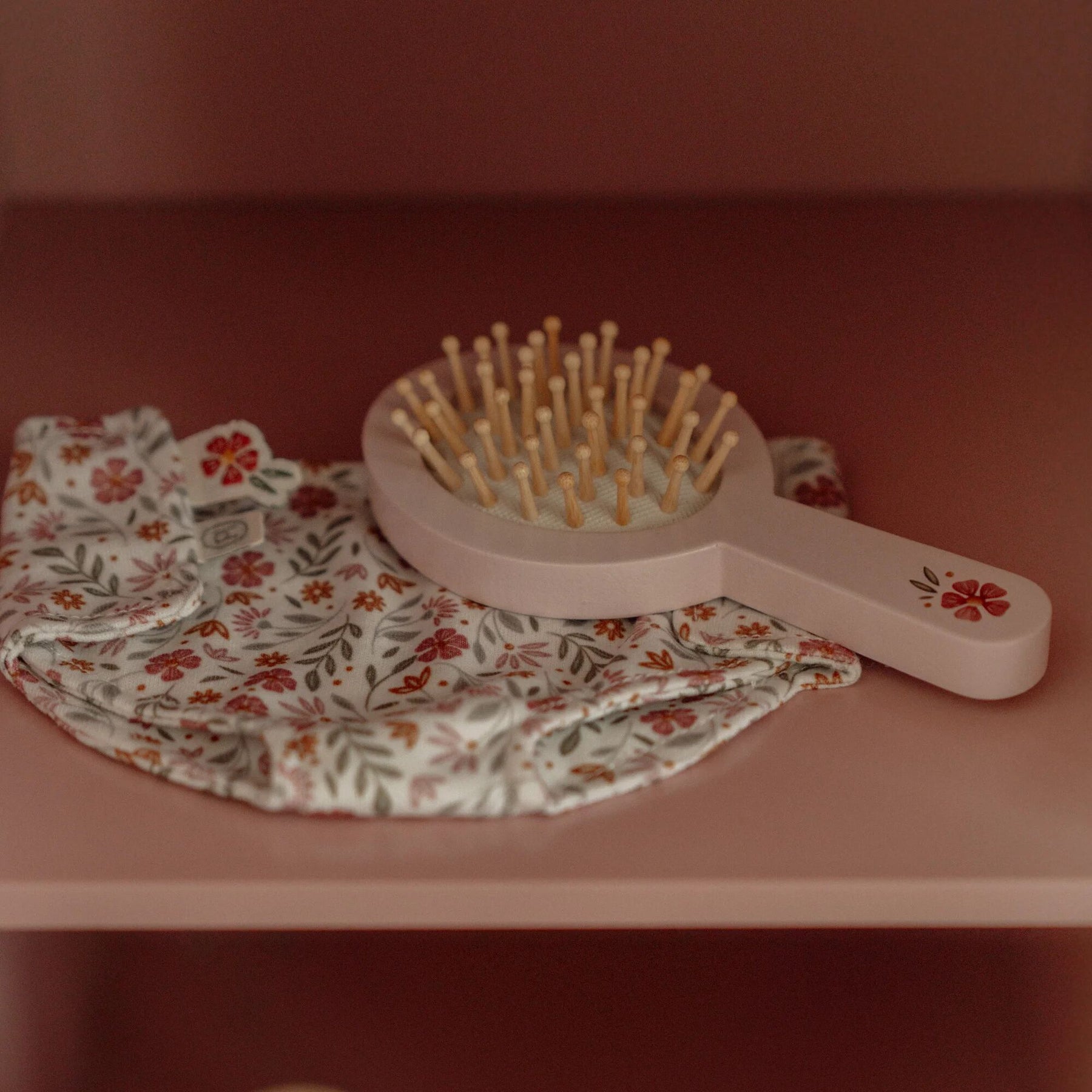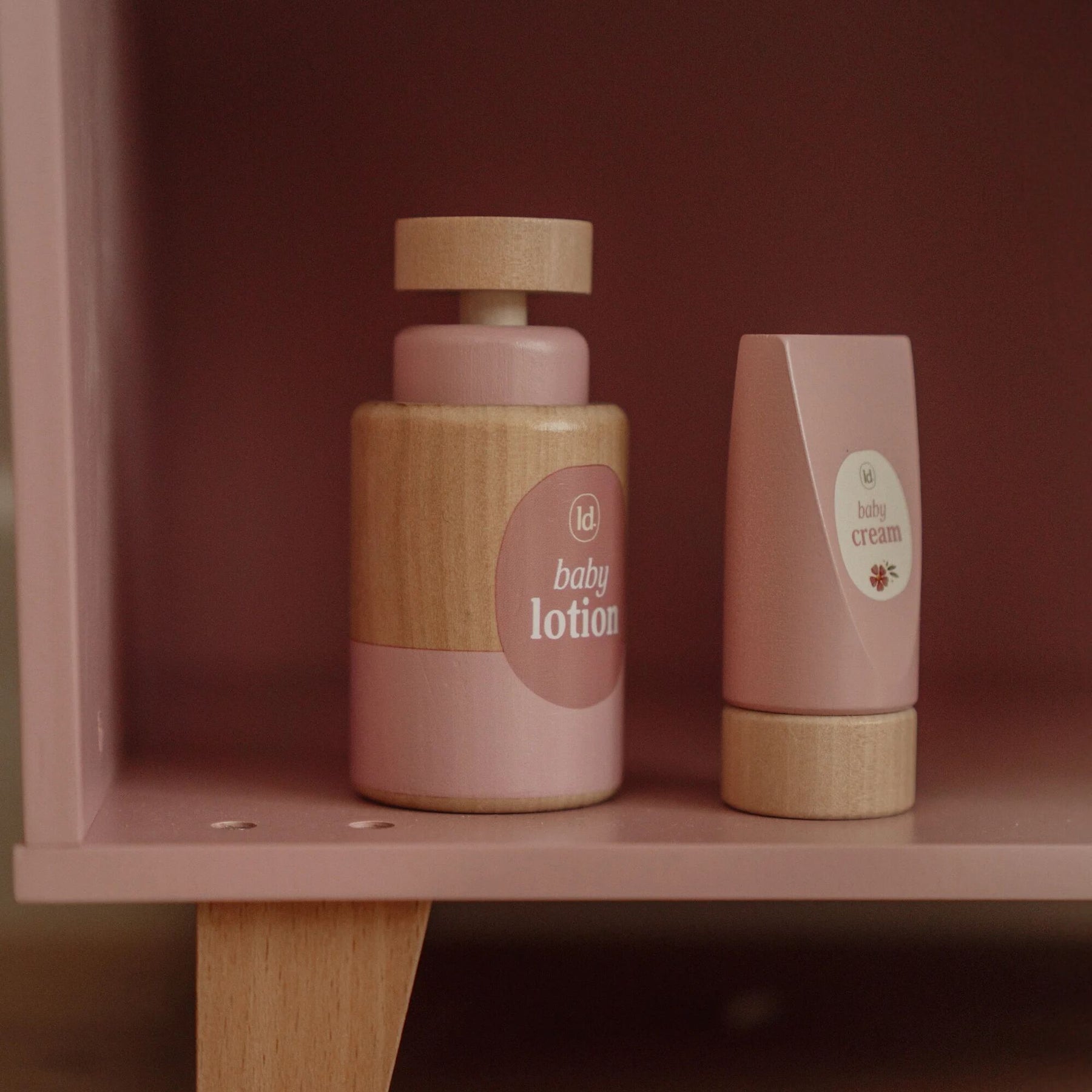 The set includes a mobile, a wonderfully soft changing mat with a dreamy design, and various wooden care accessories. Additionally, the changing table comes with a diaper, a sleeping bag, and adorable clothes hangers to neatly store your doll's outfits. The cabinet provides extra storage space for all essentials, ensuring your doll is always well cared for.