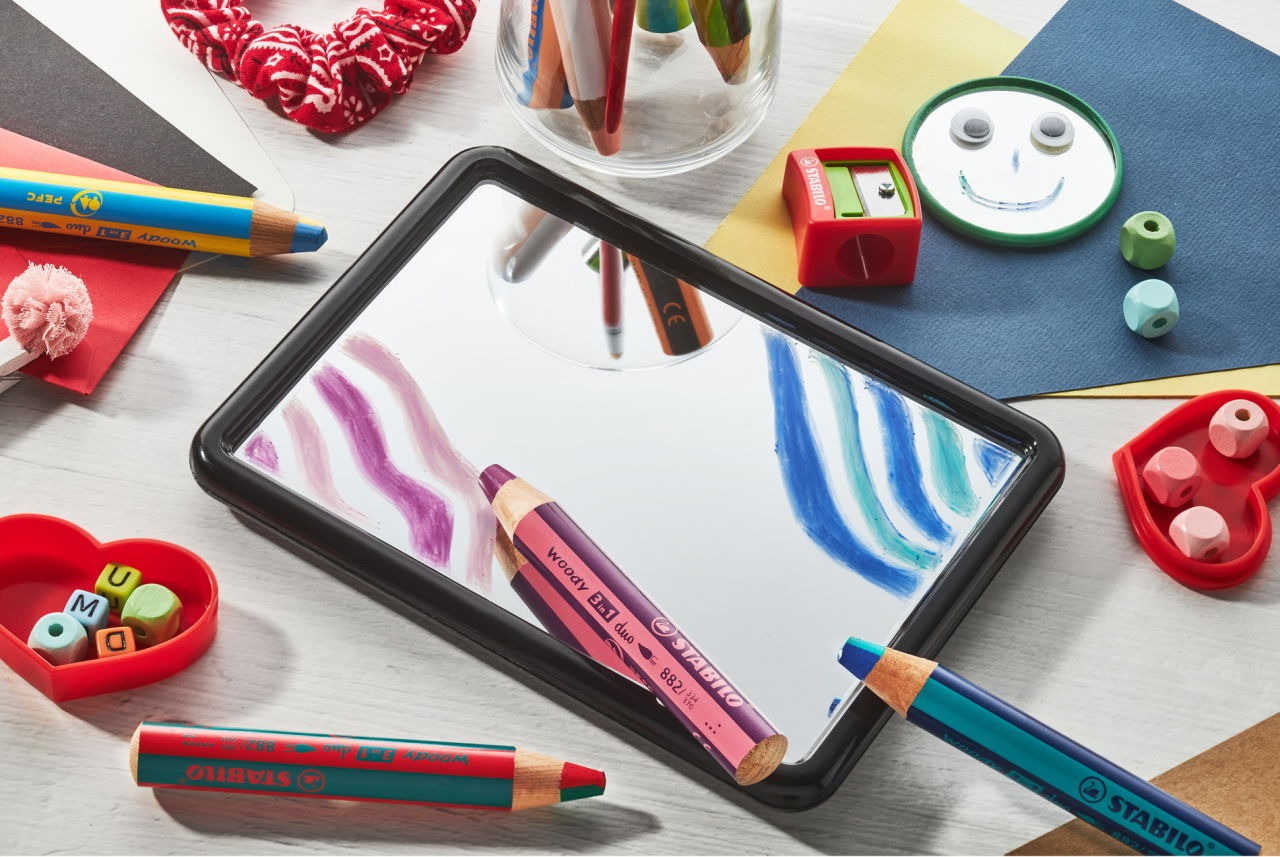 Duo lead: for double the drawing fun. 10 extraordinary colour combinations giving no limits to creativity. Create colourful painting effects with a simple turn of the pencil. The unique multi-talented pencil is a colouring pencil, watercolour and wax crayon all in one. High opacity and colour intensity, even on dark paper and glass – it can easily be removed from glass with a little water. XXL lead – applies as much colour as 8 standard coloured pencils.
