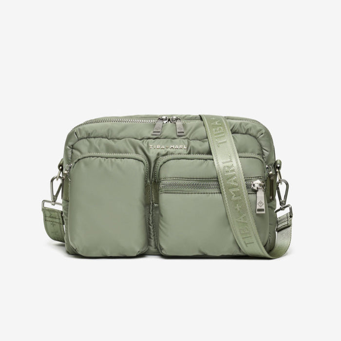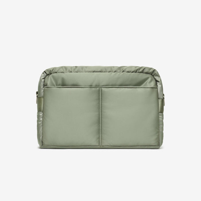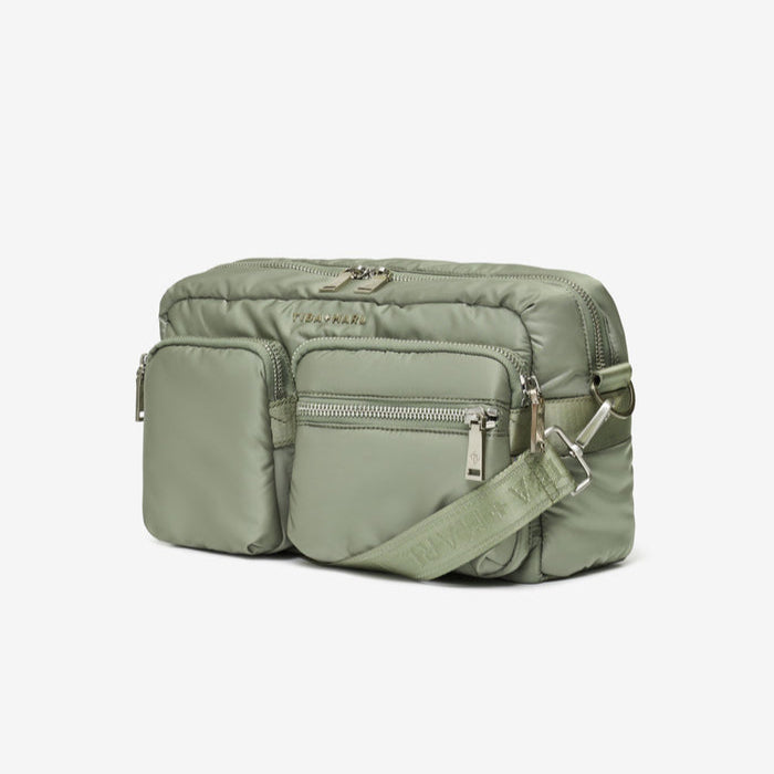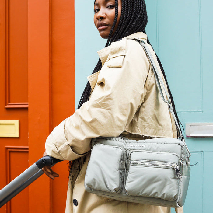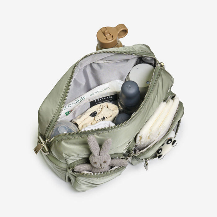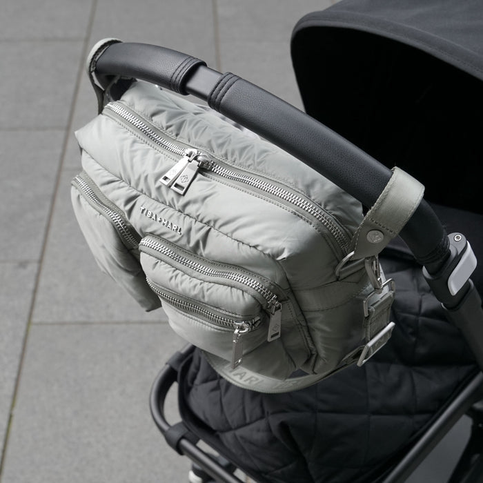 Made from water-resistant sage nylon with matching straps and zips, finished with sleek brushed silver hardware and a 100% recycled lining. This clever hybrid easily switches from bag to buggy organiser thanks to its detachable cross-body strap and velcro stroller attachments.