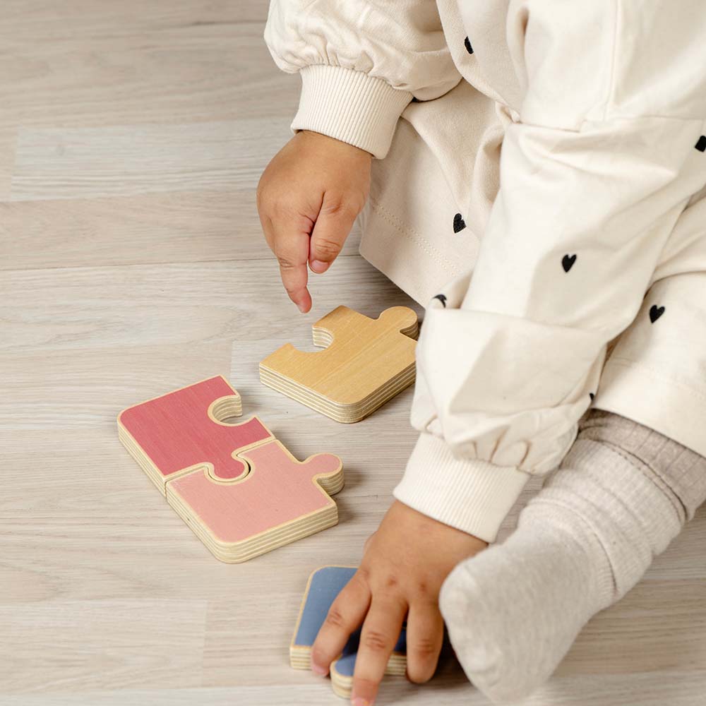 Double-sided puzzle with different themes on each side. One side is a colour puzzle, the other side is a bunny puzzle. For colour puzzle, kids can do it freely with their imagination and creativity. For bunny puzzle, it will be a challenge to work out the correct pattern.