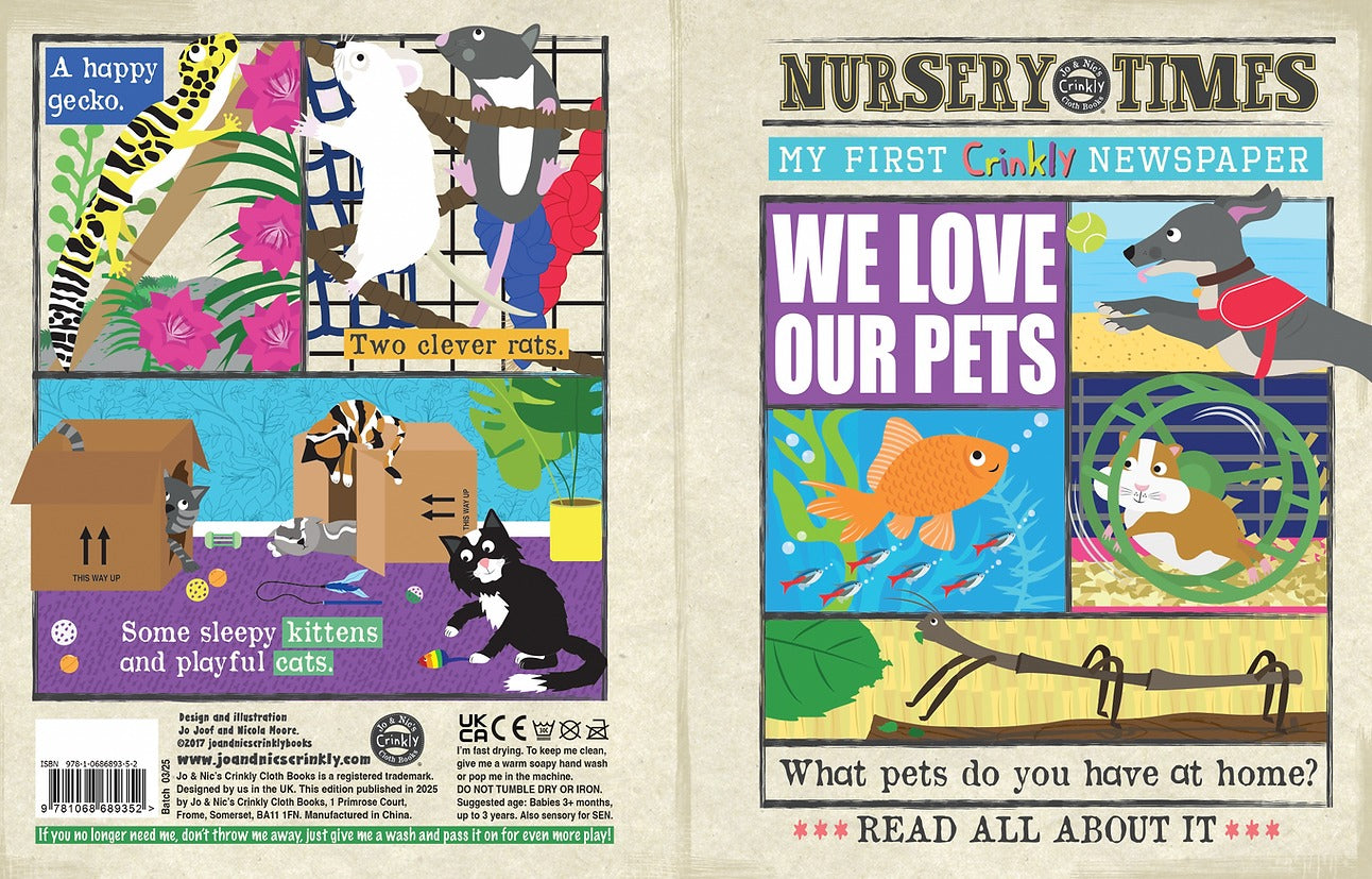 Discover the joy of pets with Jo & Nic's Crinkly Cloth Books - We Love Our Pets! This delightful book introduces little ones to a charming menagerie, from playful dogs and curious cats to gentle tortoises, colorful geckos, cheeky rats, shimmering goldfish, cuddly hamsters, fluffy guinea pigs, clucking chickens, majestic horses, and even a surprising stick insect. Each page features simple, catchy rhymes paired with fun, vibrant illustrations designed to engage babies and toddlers. Soft and crinkly, this tactile book sparks sensory exploration and early language skills, making storytime an interactive adventure full of furry, feathered, and scaly friends to love!
