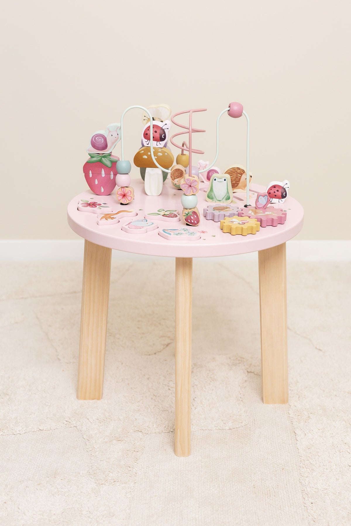 Stand up to play! Discover the many‚ activities this table has to offer. Bring the‚ beads along the spiral from one side of‚ the magical garden to the other side. Or‚ build a tower and fill the garden with flowers and joy. Complete the puzzle, turn‚ the wheels and help the lovely animals‚ cross the Fairy Garden.