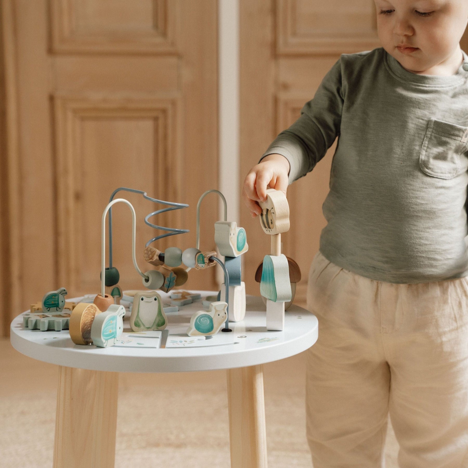 Stand up to play! Discover the many activities this table has to offer. Bring the beads along the spiral from one side of the enchanted forest to the other side. Or build a tower and fill the forest with trees of joy. Complete the puzzle, turn the wheels and help the lovely animals cross the Forest Friends woodlands.