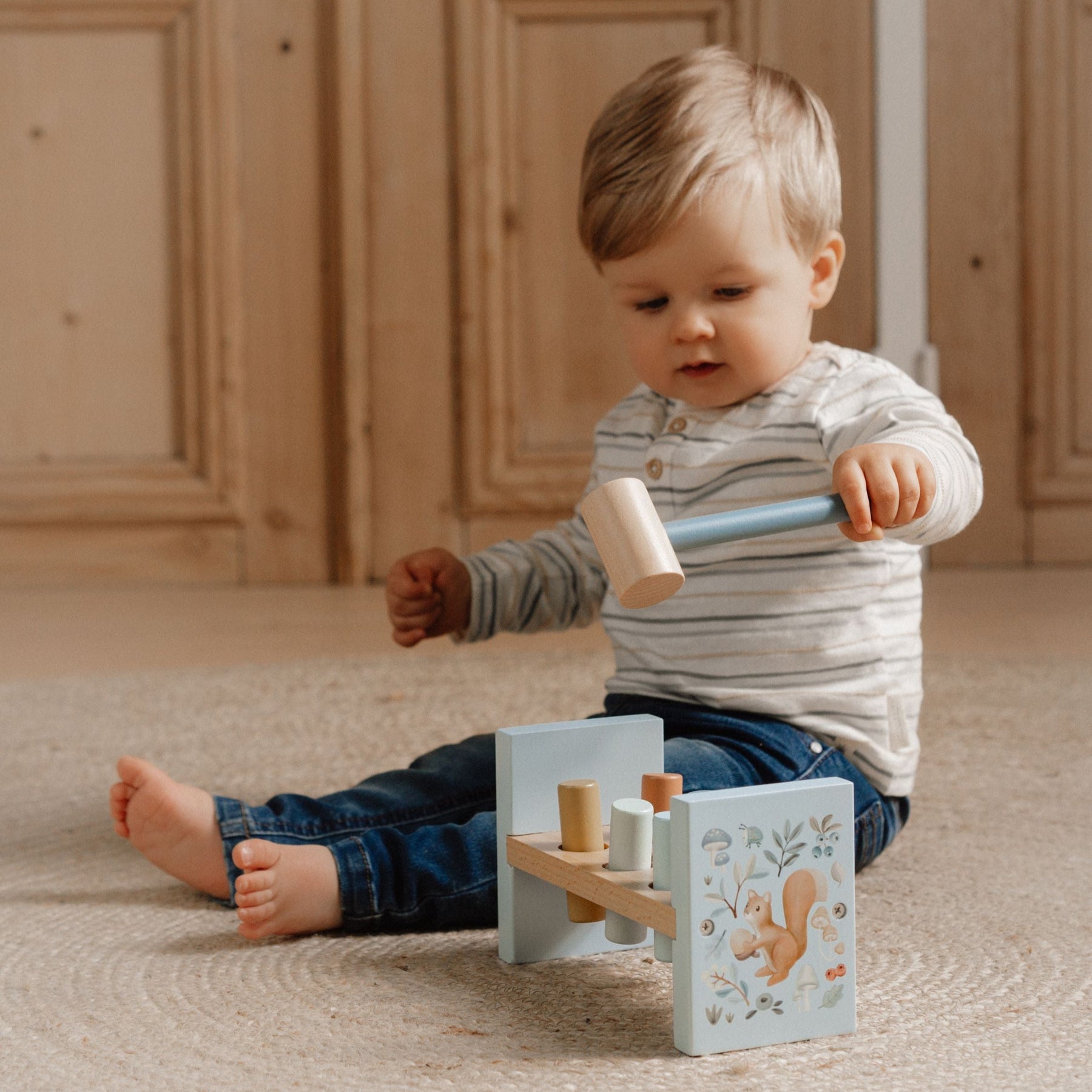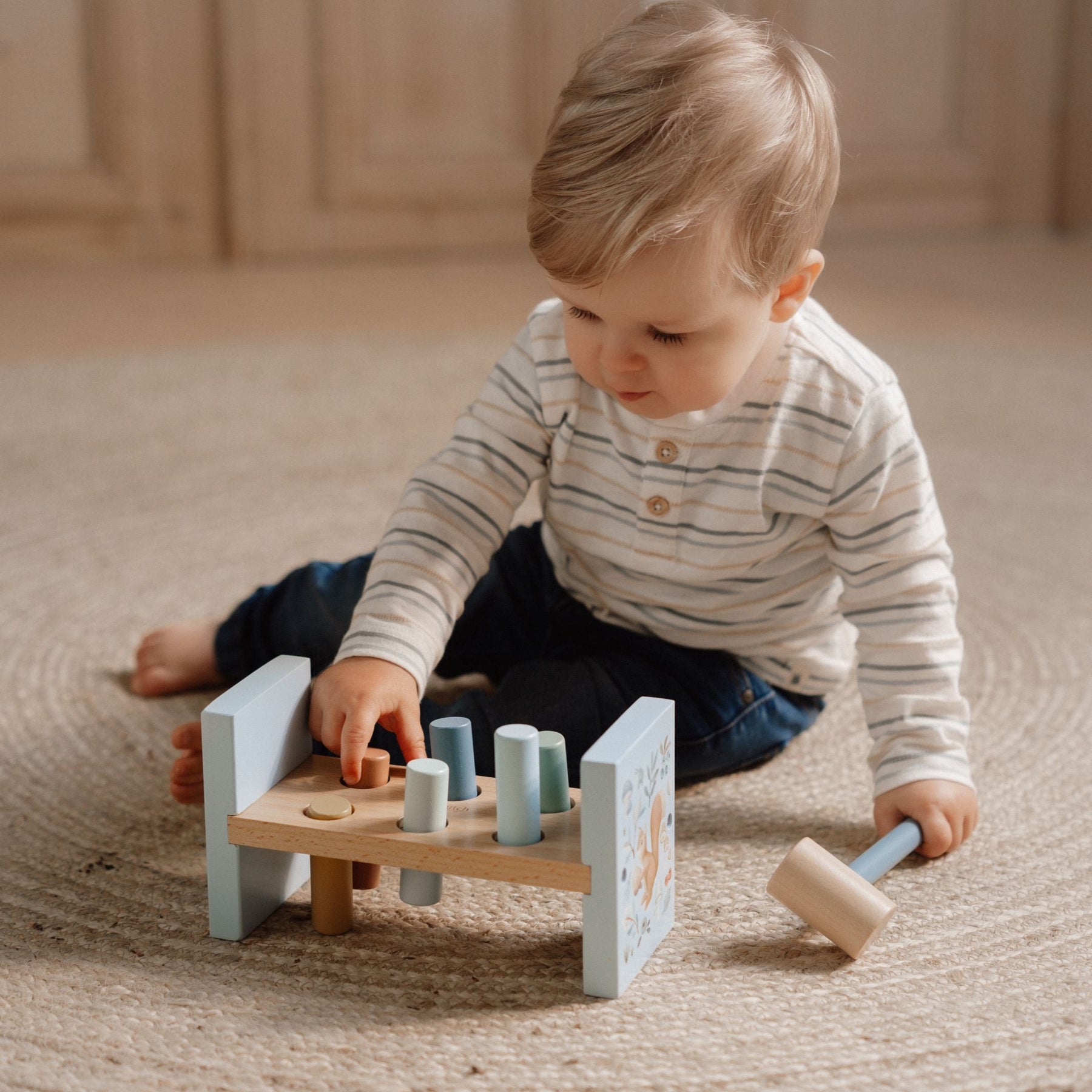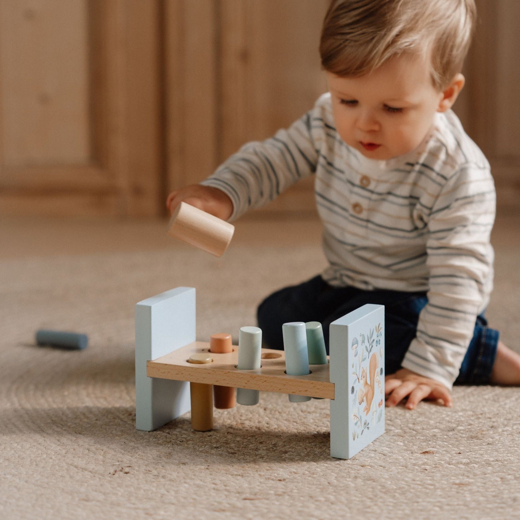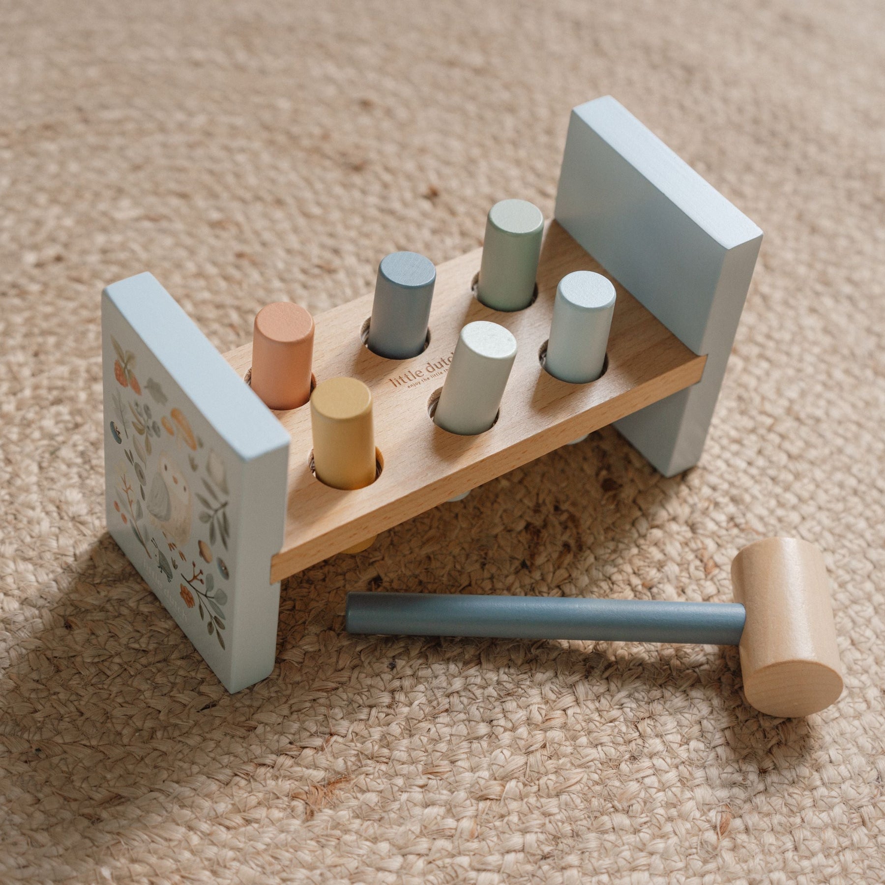 Tap tap tap! Use the mallet to pound the 6 coloured pegs into the wooden Little Dutch pounding bench and explore the magic of Forest Friends. This is a very good exercise for the development of motor skills that will surely keep your little one entertained for a while. Explore the full Little Dutch range or shop our playtime collection. Features of the Little Dutch Pounding Bench: