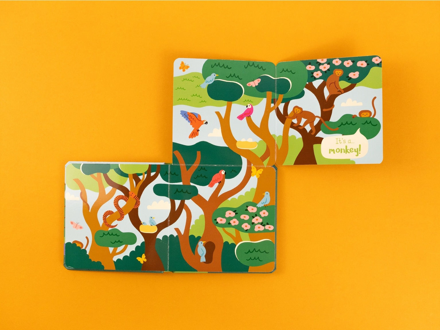 book for babies and toddlers. Discover animals across five exciting spreads, from the Savannah and treetops to hidden caves, the ocean and more. Each flap section opens twice, offering double the surprises and extra fun for curious little explorers. Made with chunky, durable board pages and filled with colourful artwork, this engaging book is perfect for small hands. Suitable from 6 months upwards, it’s a fun way to introduce little ones to the animal world, spark imagination, and enjoy interactive reading together.