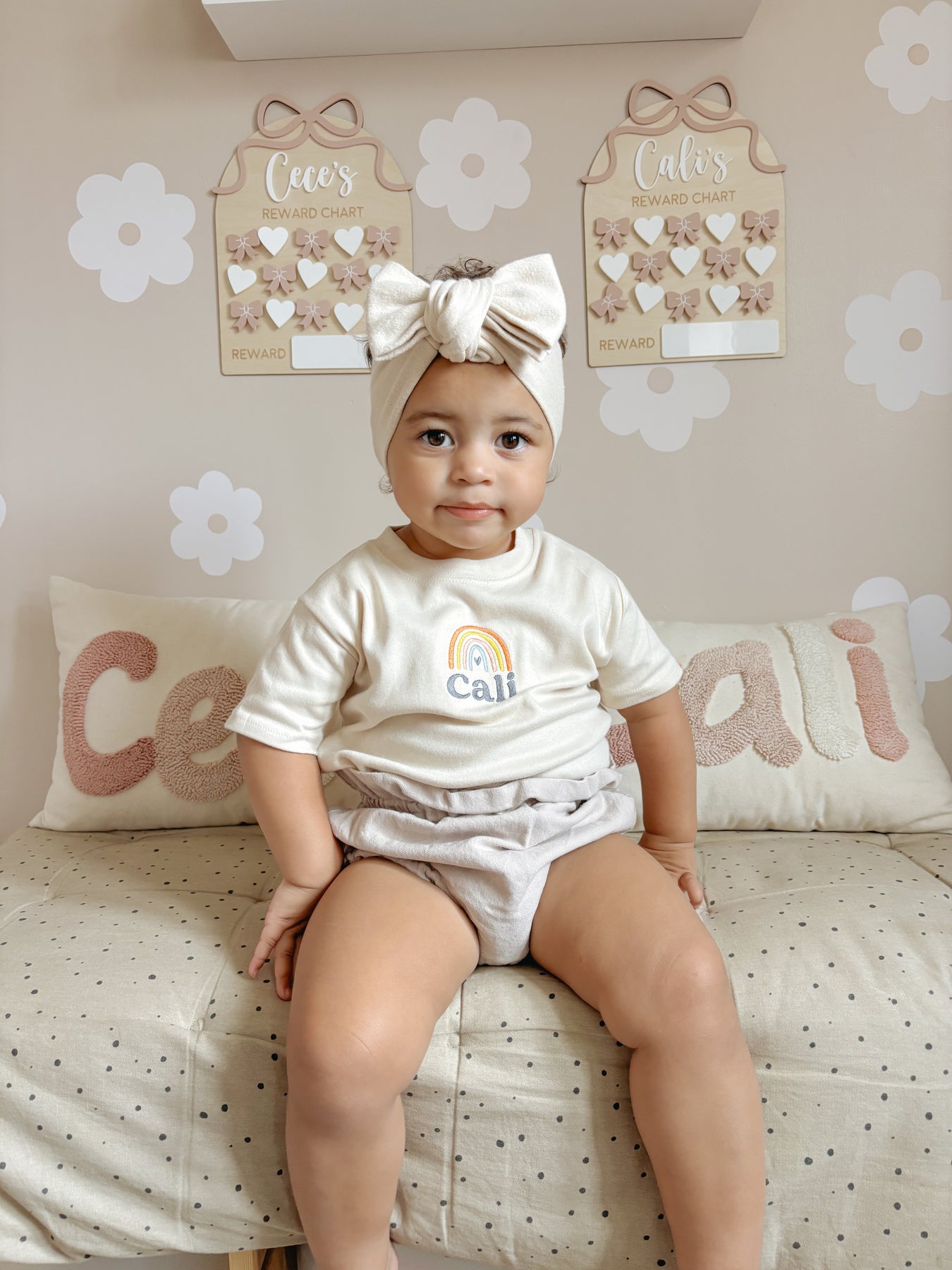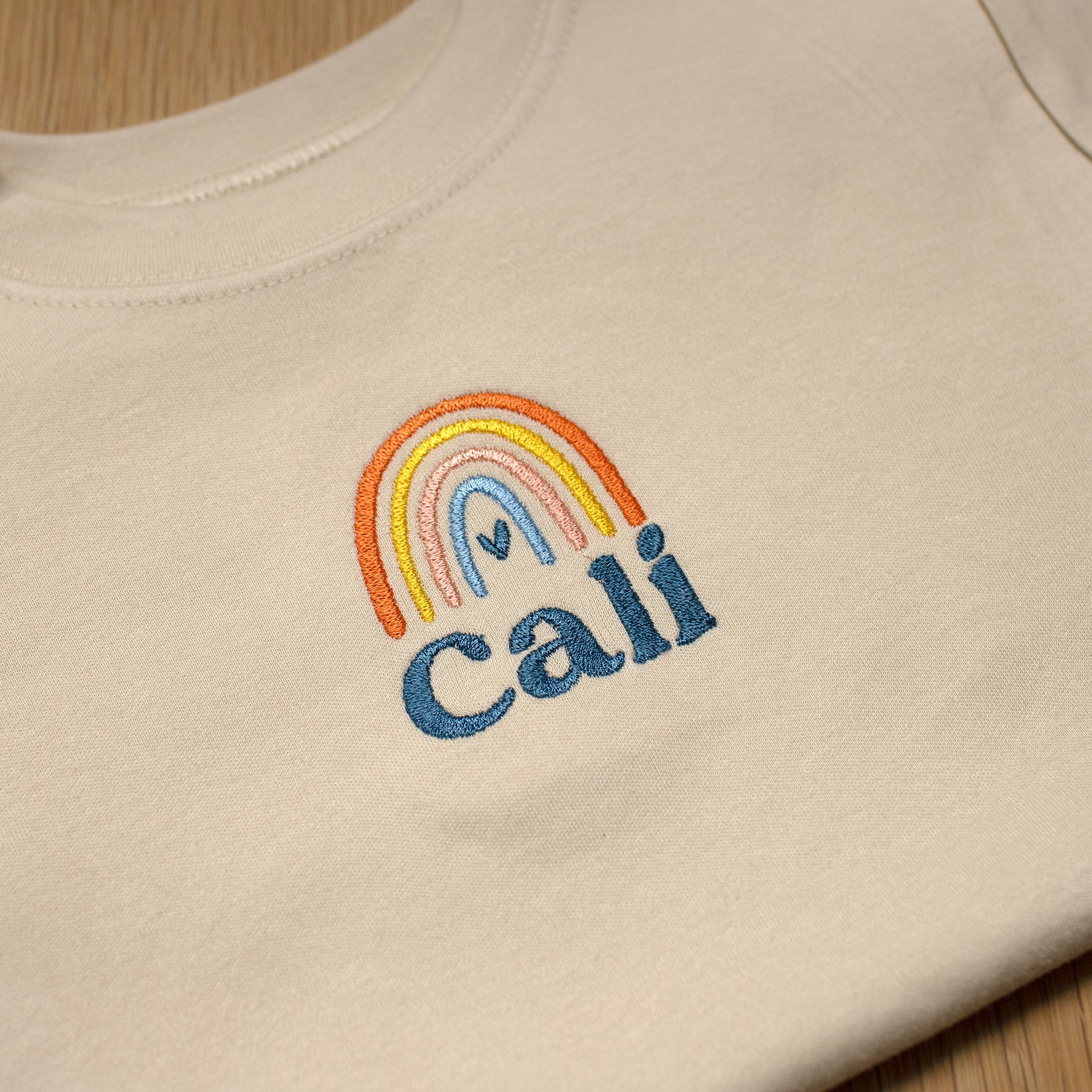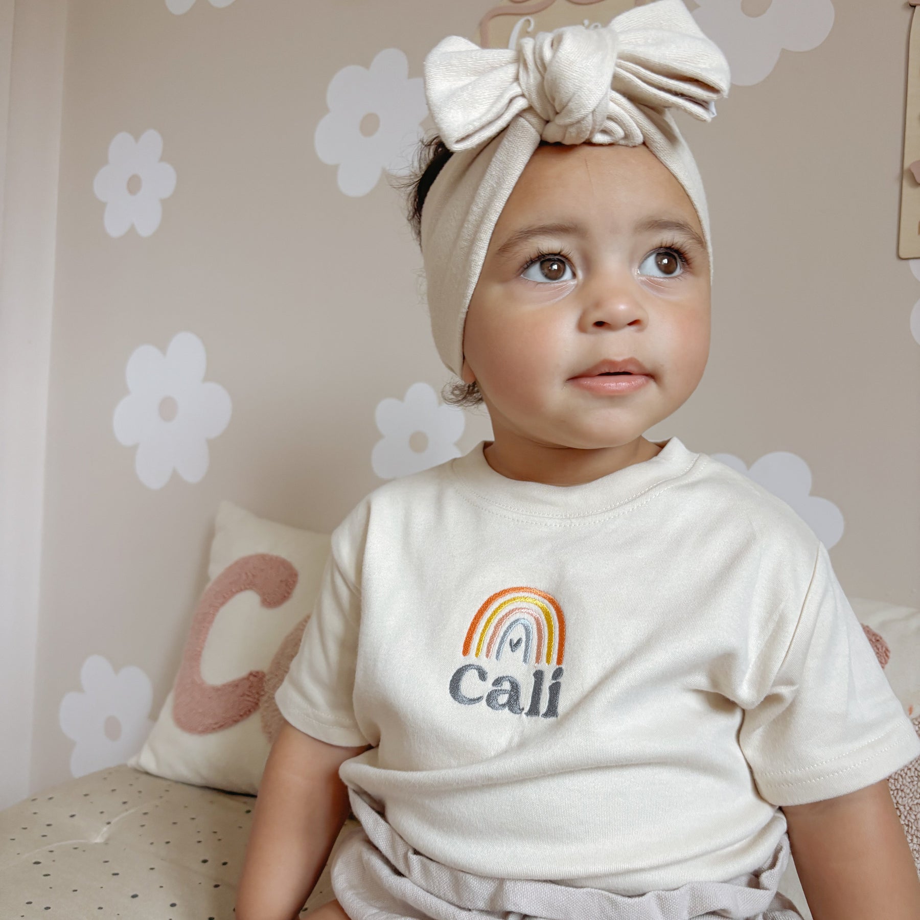 This super-soft Mabel & Fox beige t-shirt is the perfect blend of comfort and charm for little ones. Beautifully embroidered with a rainbow design, it can be personalised with any name to create a truly bespoke gift. This lightweight top makes a wonderful present for special occasions or everyday adventures.
