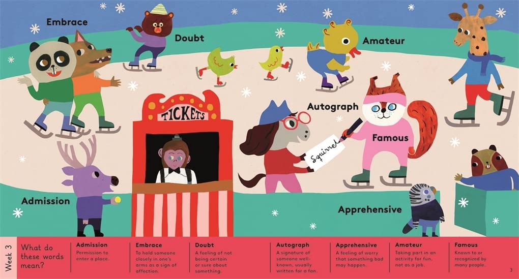 Discover a fresh and exciting word every day with this delightful book, featuring 52 spreads inspired by the seasons. Each vibrant illustration creates a playful space for young readers to explore impressive words and grow their vocabulary—an essential skill linked to future success.