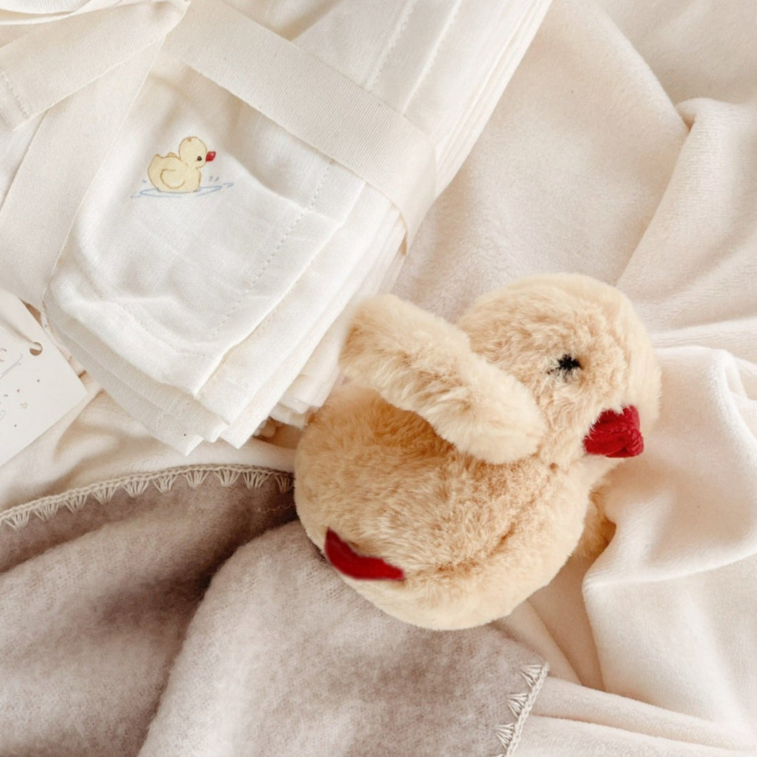 Meet Fanga: Our soft and fluffy little yellow duck that makes a comforting rattling sound when played with. Fanga is the perfect companion for squishy babies, small but delightful and perfectly fit for little hands.