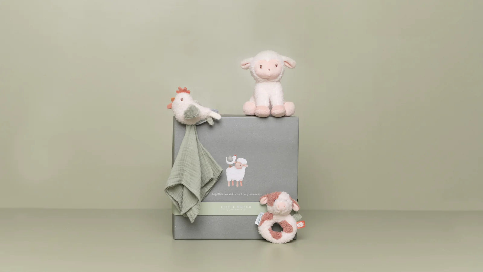 Our favourites from the Little Dutch, Little Farm collection make a perfect baby gift or baby shower present. This beautiful box contains three soft products for sleeping, cuddling, and playing. The soft cuddle cloth with a cute little chicken is perfect for snuggling, but also great for a game of peek-a-boo. The cuddly sheep is always up for a big hug and likes to go everywhere. This set also includes a cow ring rattle for playing with, which stimulates hand-eye coordination and curiosity in babies. All three products are packaged in one beautiful gift box.