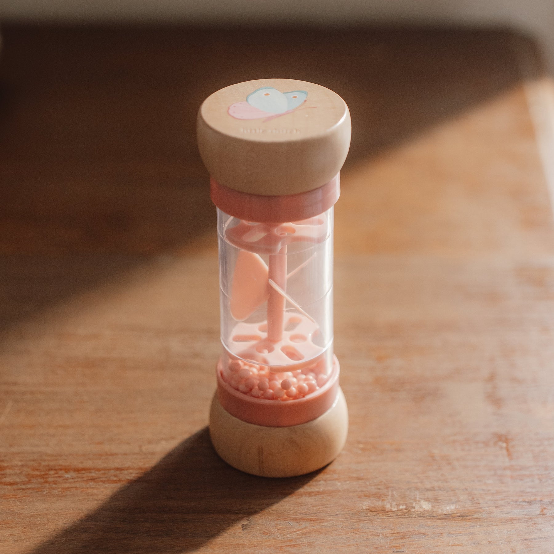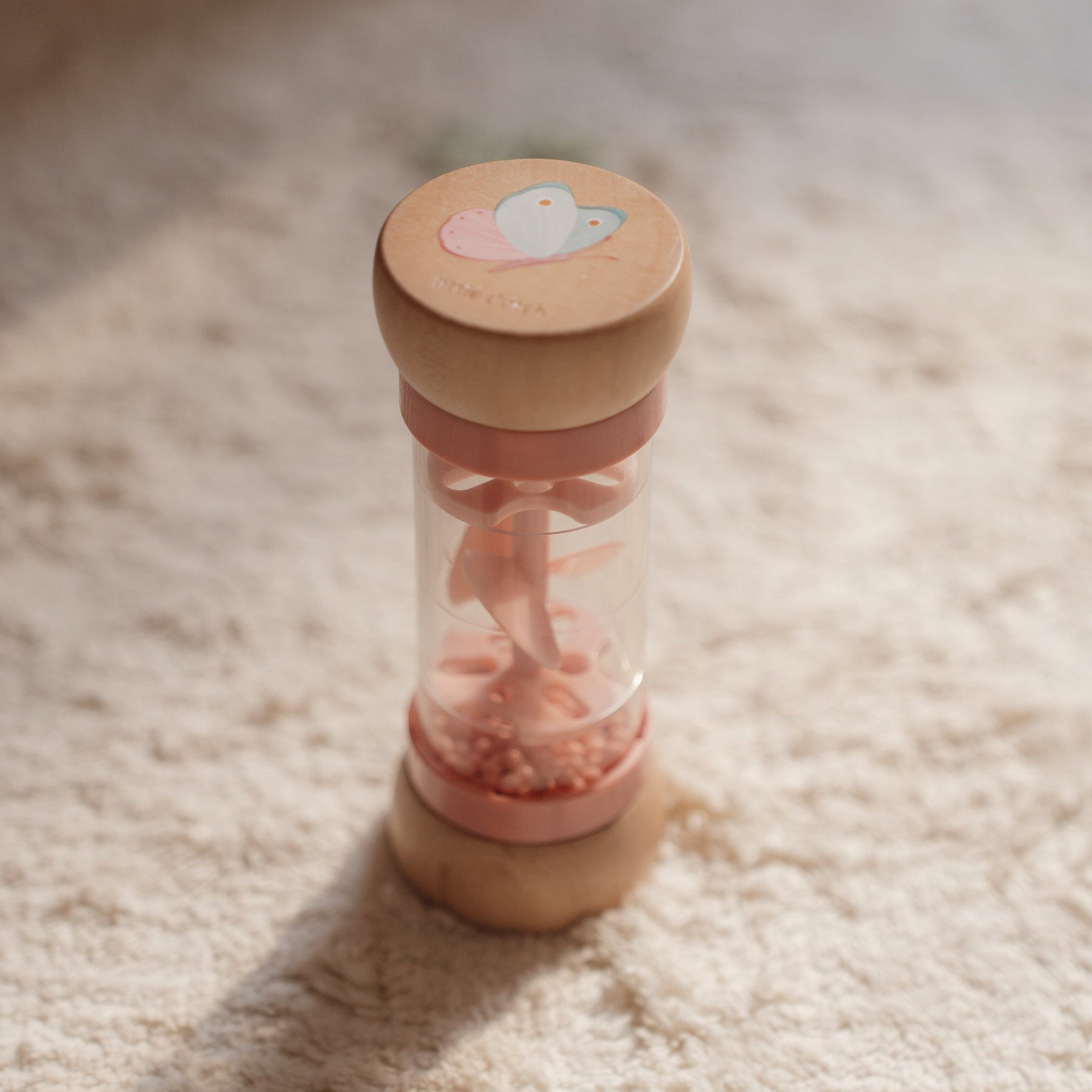 The rain rattle is designed for little hands and is comfortable to hold. The wooden top and bottom are decorated with an illustration of a flower and a butterfly from the Fairy Garden collection.