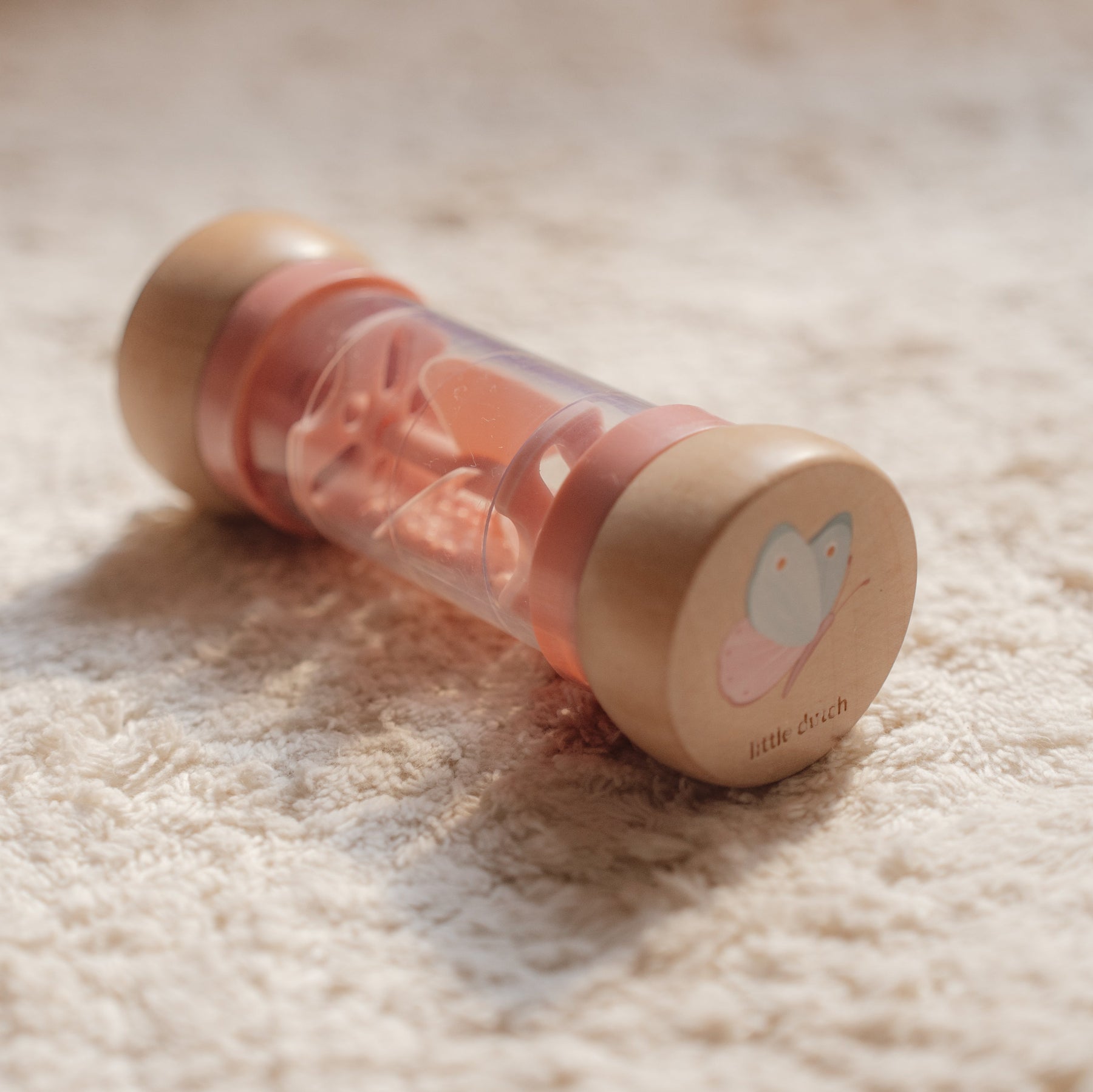 Shake and rattle! Turn the Little Dutch rain rattle and listen to the soothing sound of the balls moving from one side of the rainmaker to the other. It stimulates the sensory development and musical talent of your baby. The balls fall through small openings in the tube and rotate the propeller, resulting in a pleasant sound.