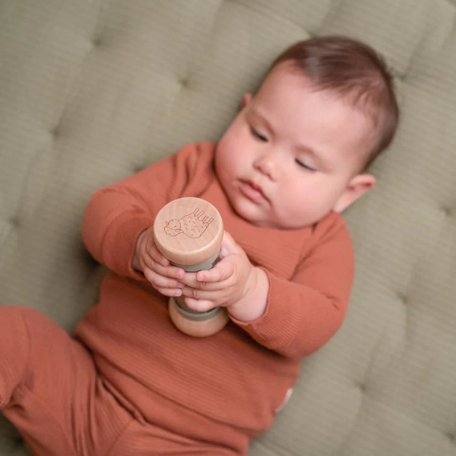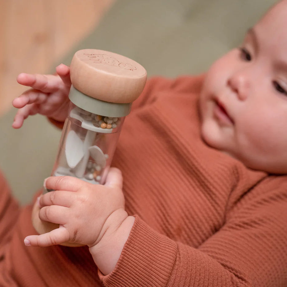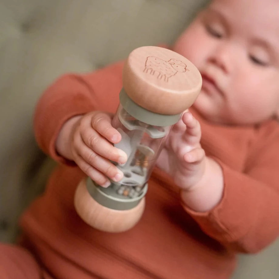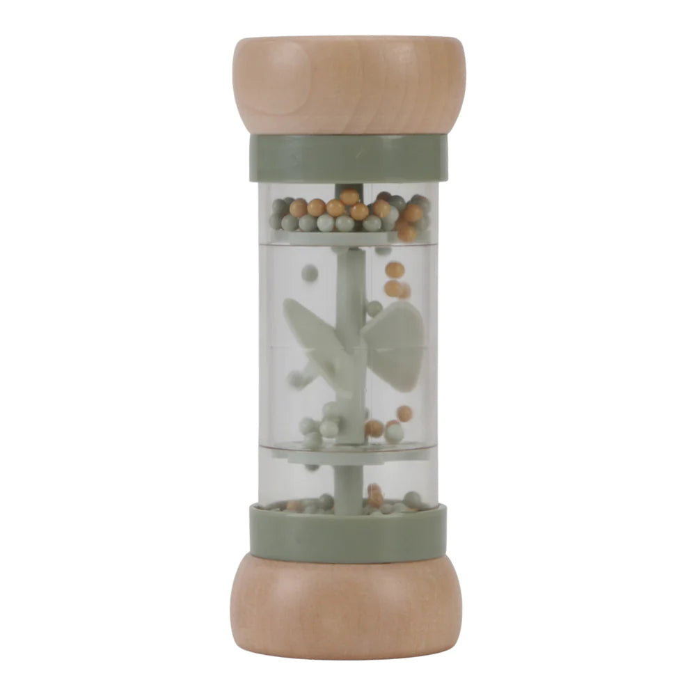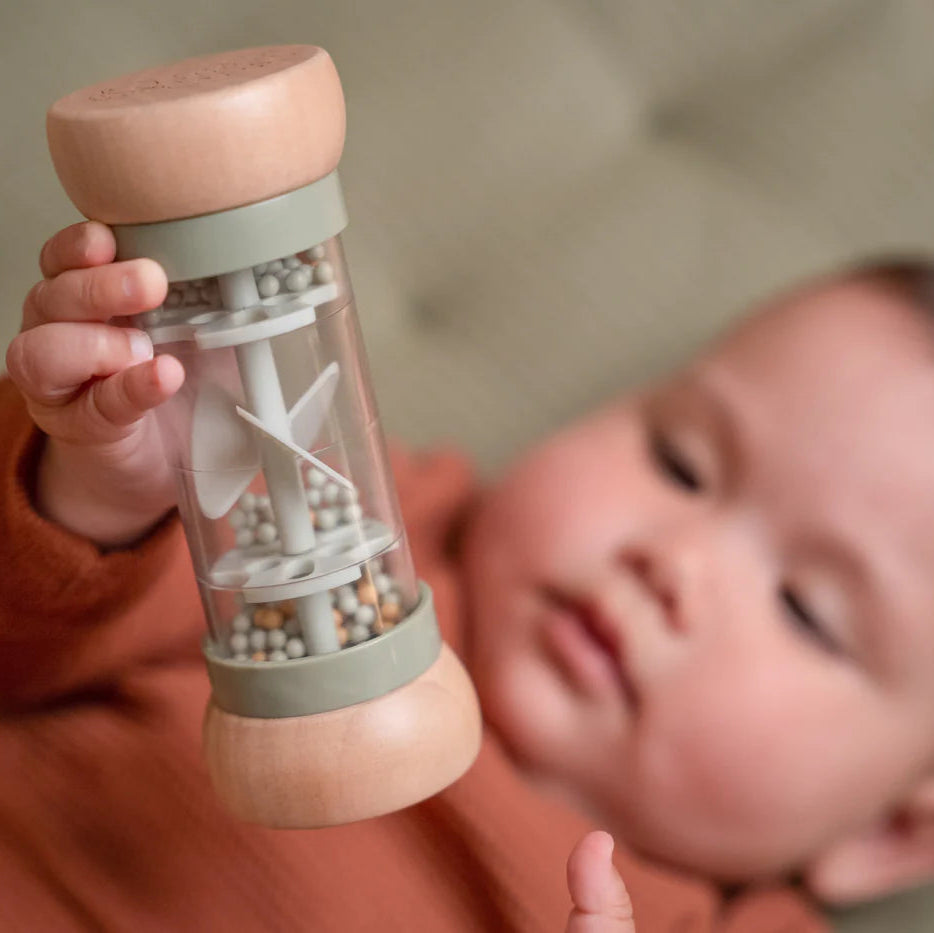 Shake and rattle! Turn the Little Dutch rain rattle and listen to the soothing sound of the balls moving from one side of the rainmaker to the other. It stimulates the sensory development and musical talent of the baby. The balls fall through small openings in the tube and rotate the propeller, resulting in a pleasant sound.
