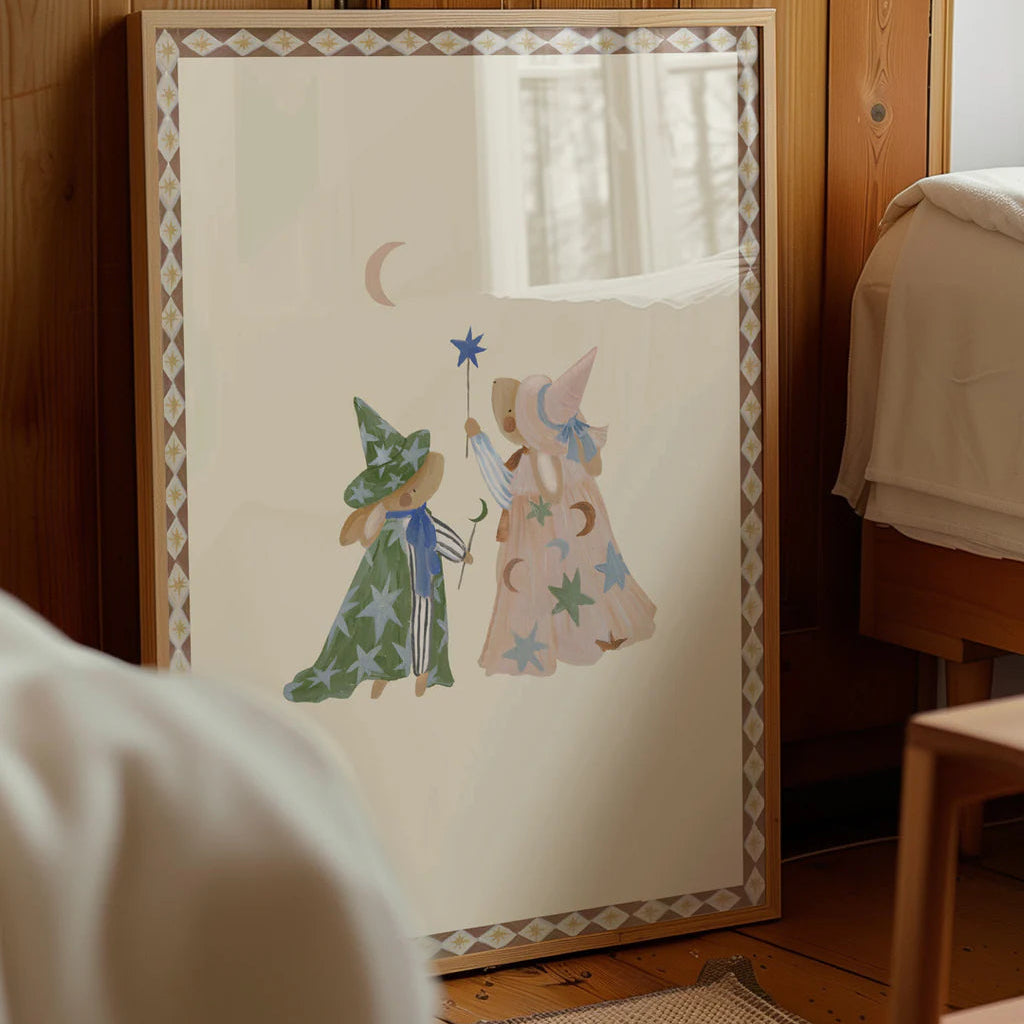 Wizards and Witches print- Bring a touch of magic to your little one’s room with our brand new art print. Hand-painted in acrylic, this enchanting design features two sweet bunny friends or siblings dressed as whimsical wizards under a pink moon.