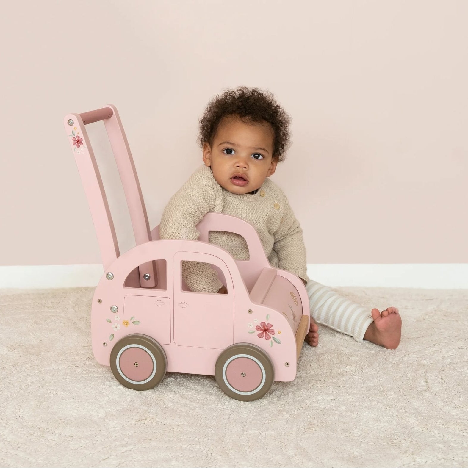 And off you go! Embark on an adventure through the living room with this pink Little Dutch push cart. Step by step, you'll learn to walk, and this push cart will help you along the way. So, rev up your engine and pretend to be the driver of this push cart with subtle floral details and a touch of vintage charm. The wooden pink push cart isn't just handy for assisting your little one's first steps, but its design also doubles as a perfect toy chest for your baby.