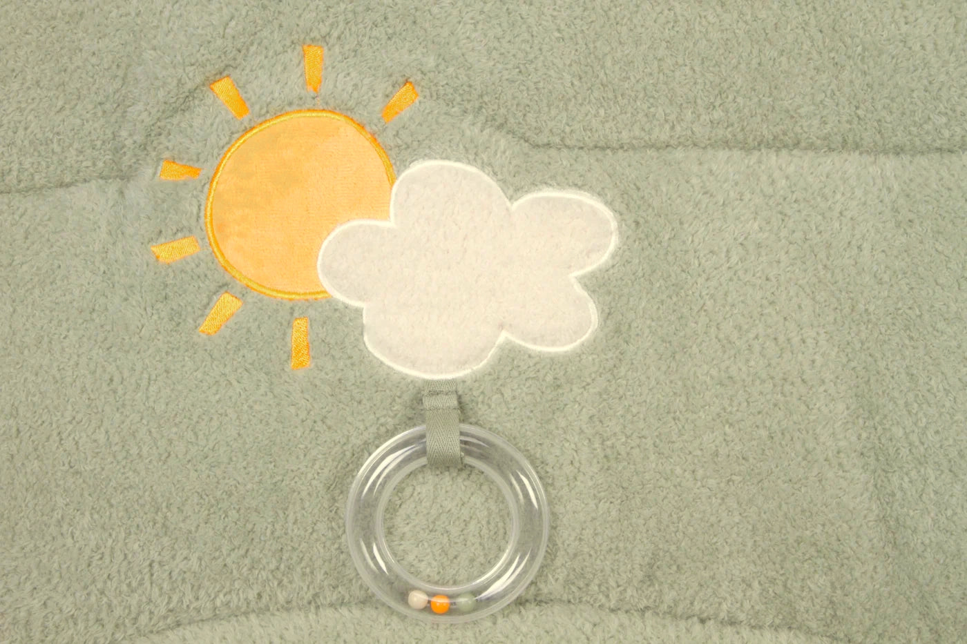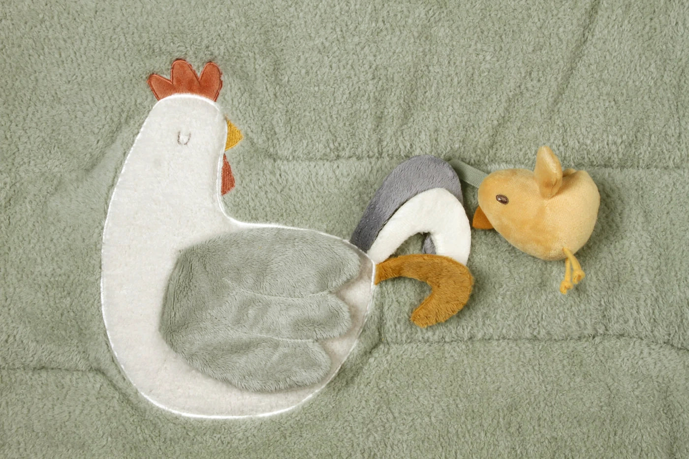 This padded play mat from the Little Dutch, Little Farm collection stimulates your child's senses with its different textures and activities. There is so much to discover and see! The wings of the chicken make a crinkling sound, and you can discover what's hidden underneath them. The clouds have a soft teddy fabric and there are various labels to discover. There is also a teething ring attached to the play mat.
