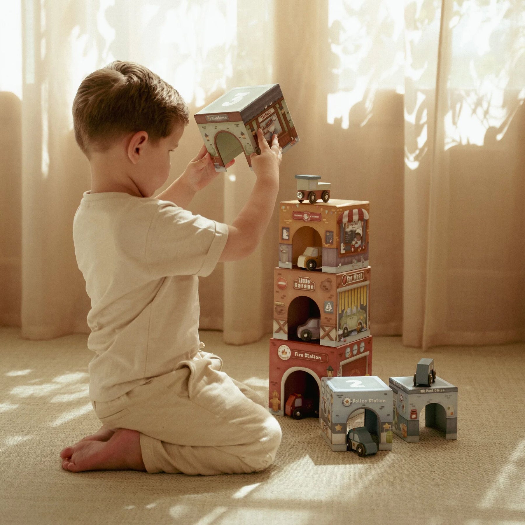 This set of 6 illustrated cardboard blocks with matching vehicles offers endless playtime fun. Stack the blocks on top of each other or place them over the Little Dutch Railway XL, allowing the vehicles to drive underneath effortlessly. Each block has unique illustrations and its own vehicle that fits perfectly. A playful way to stimulate imagination and motor skills!
