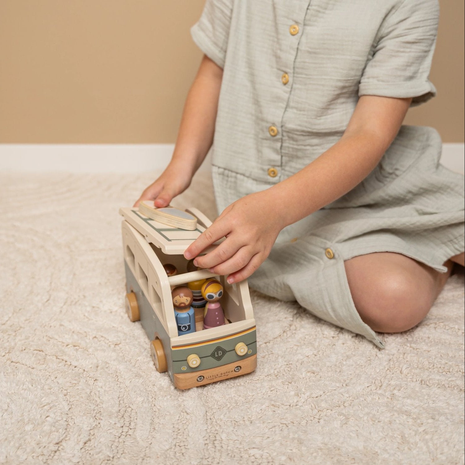Take the whole family on the road in this beautiful Little Dutch Vintage Campervan. Get into the van and don't forget to bring your suitcase, beach bag and surfboard. This beautiful wooden play set consists of a campervan with a removable roof, 4 dolls and 3 pieces of luggage.