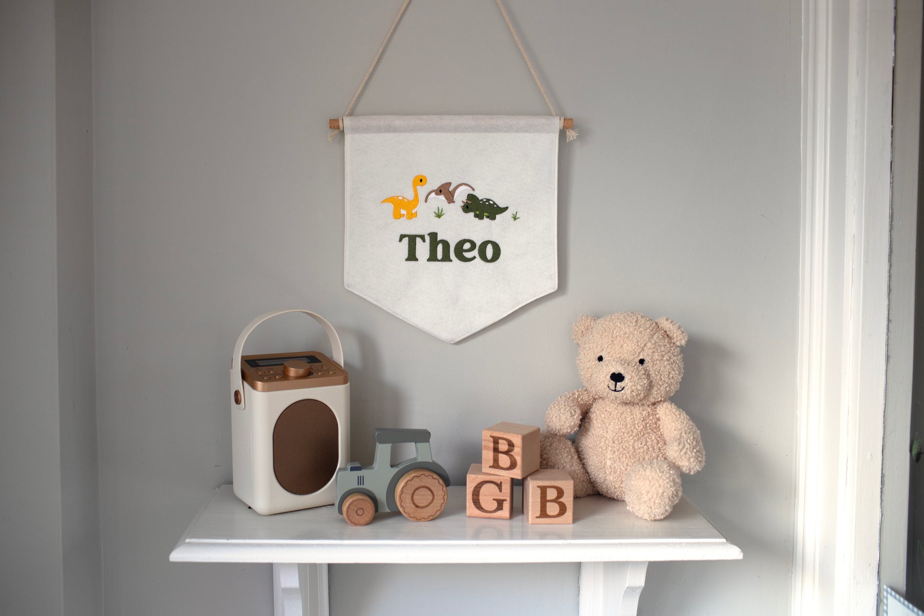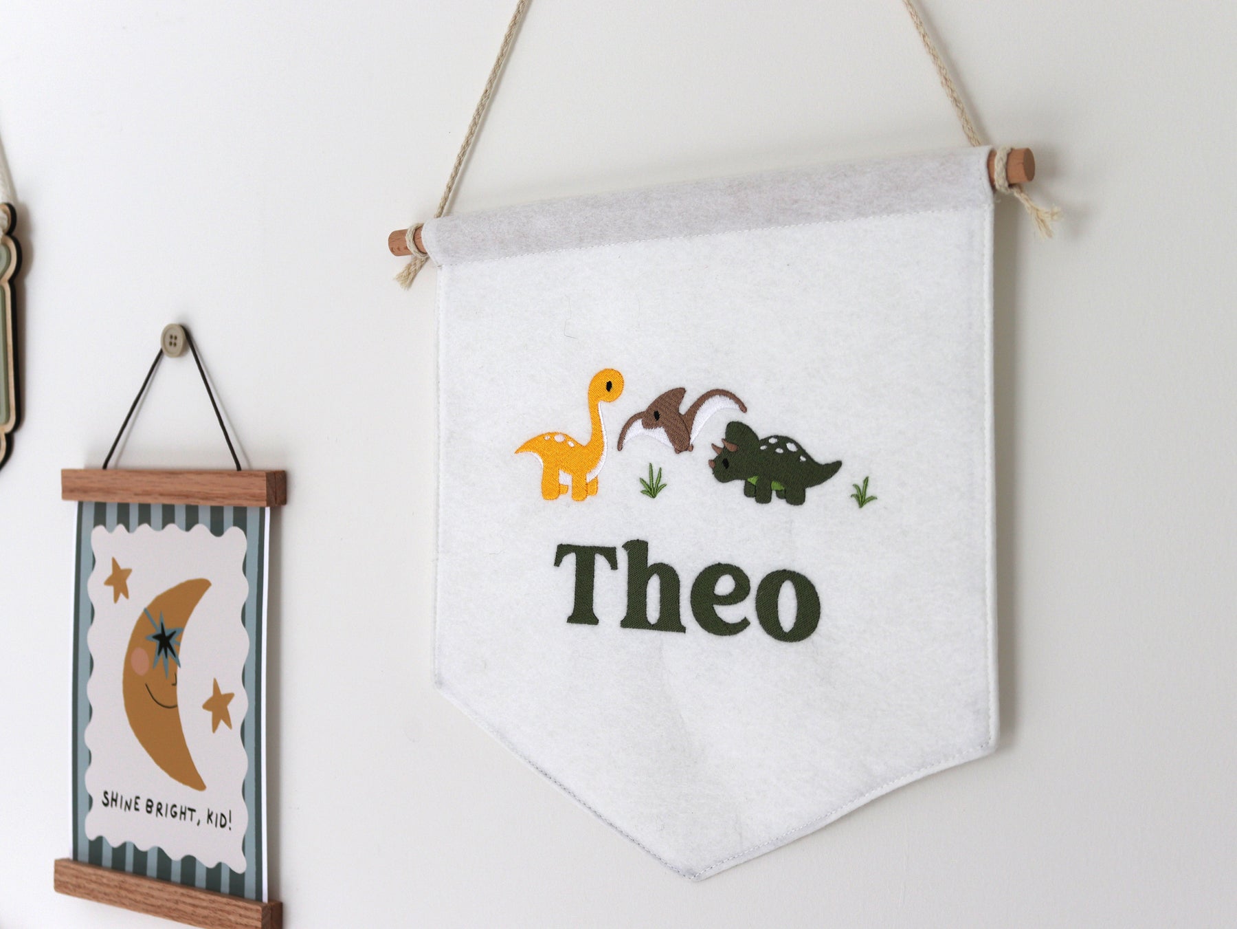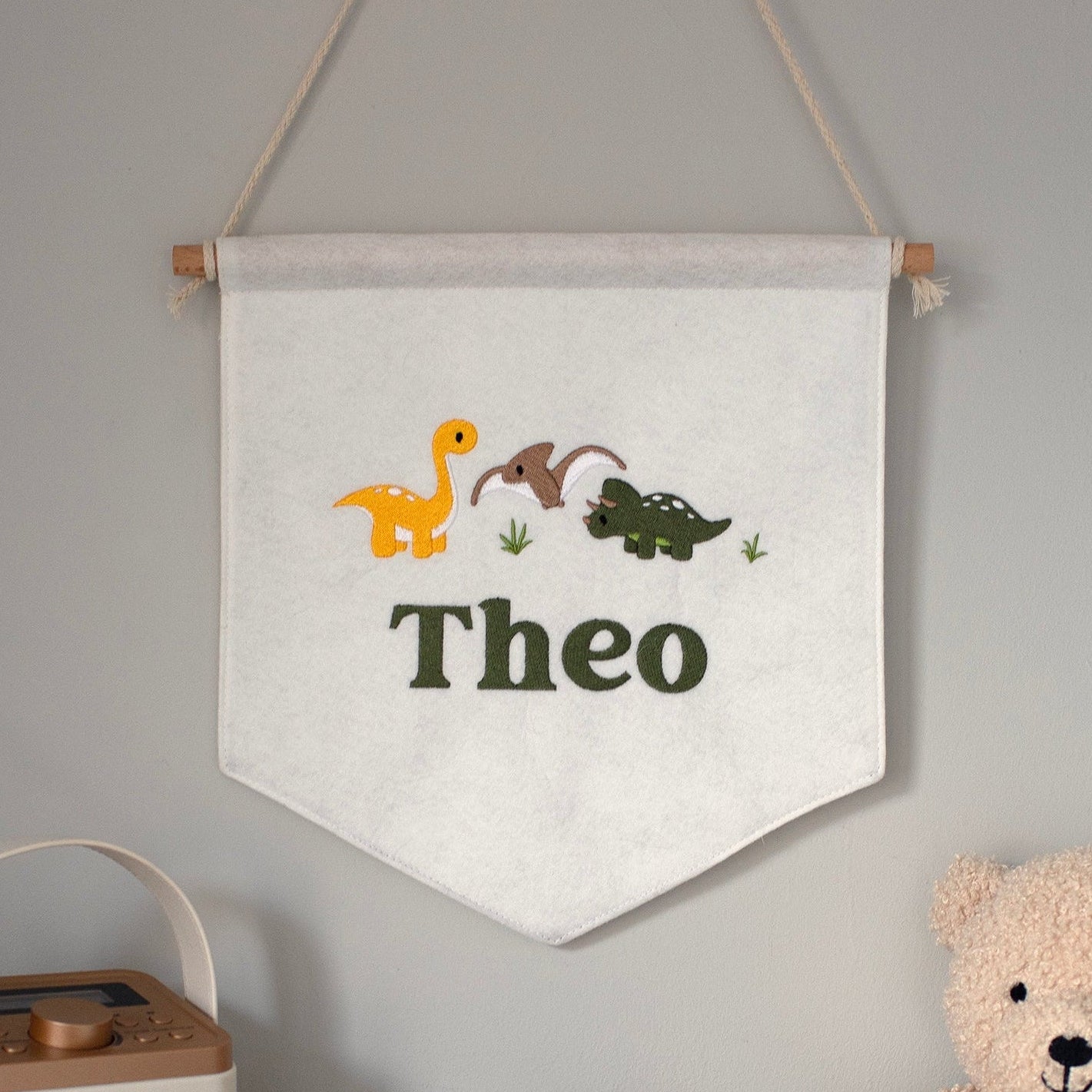 Our Mabel & Fox Personalised Dinosaur Flag, makes the sweetest little statement piece for your child’s nursery or playroom. Crafted from beautifully thick, high-quality felt, each flag features an adorable embroidered dinosaur design and is personalised with your chosen name, making it extra special.