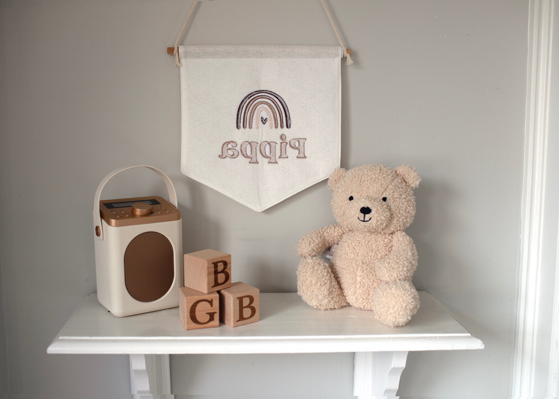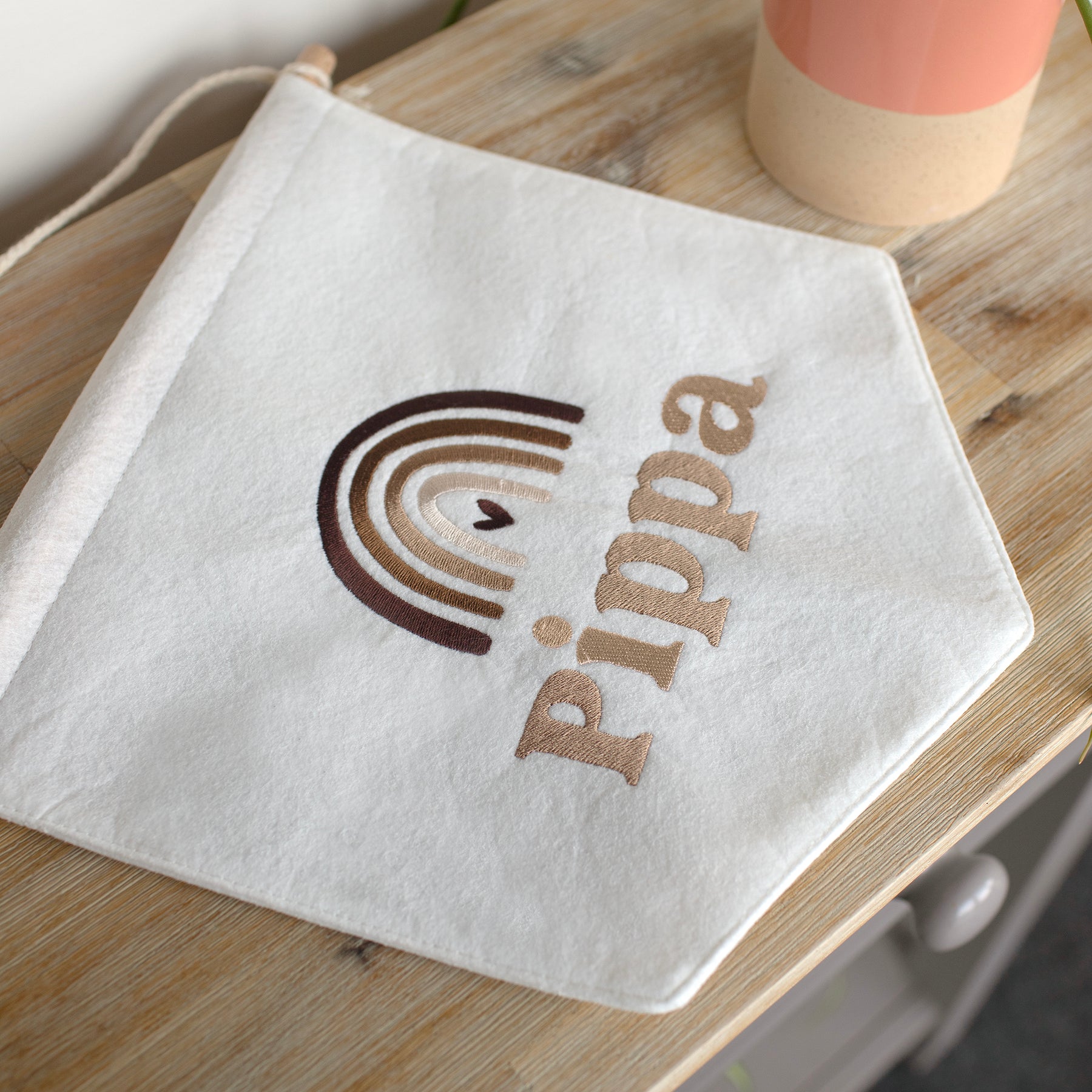 Our Mabel & Fox Personalised Rainbow Flag, makes the sweetest little statement piece for your child’s nursery or playroom. Crafted from beautifully thick, high-quality felt, each flag features an adorable embroidered neutral rainbow design and is personalised with your chosen name, making it extra special.